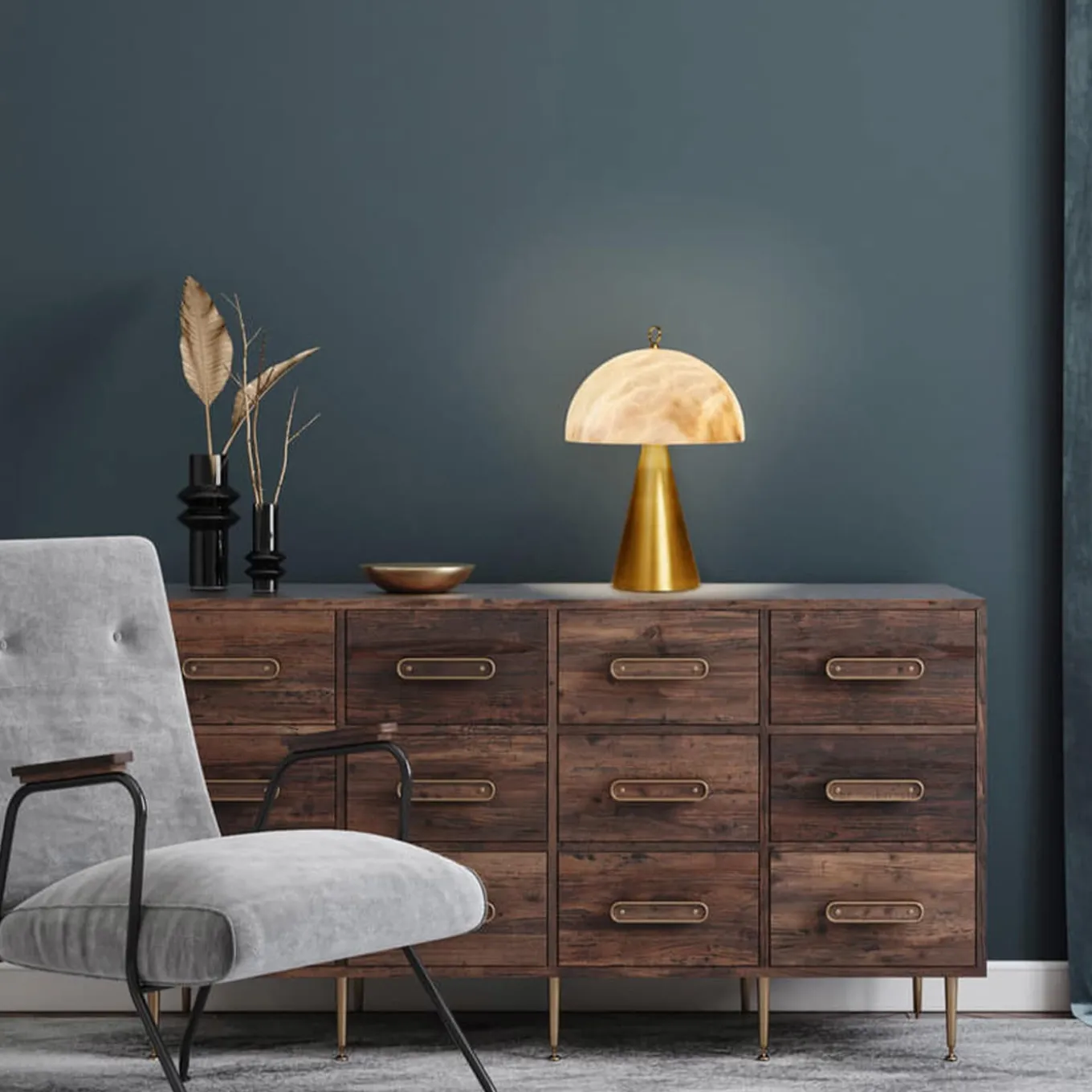 A compact table lamp: a small jewel where the veins are the protagonist on the semi-spherical lampshade or the conical alabaster base. This lamp is offered in two versions, alternating alabaster and satin brass for the lampshade and base.