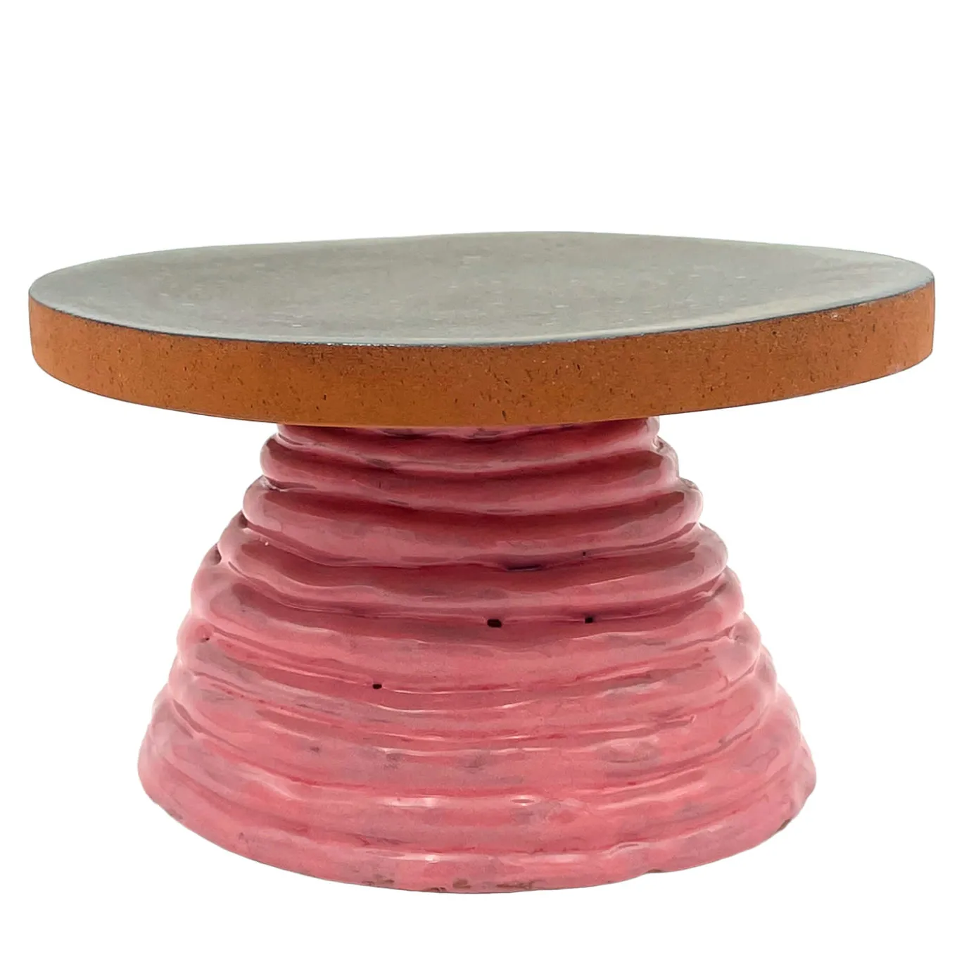 Fungo is a collection of cake stands created by Daria Dazzan. This piece is handmade and a one-of-a-kind, it is part of a limited series of 20 pieces. The element connecting all Fungo series is a solid disc of intense red clay, visible from its external edge. Stark, highly saturated, rich color combinations are the fine features of the pieces that Daria Dazzan creates at her multidiscipline atelier in Milano. All pieces may have natural, yet unique indistinct irregularities.