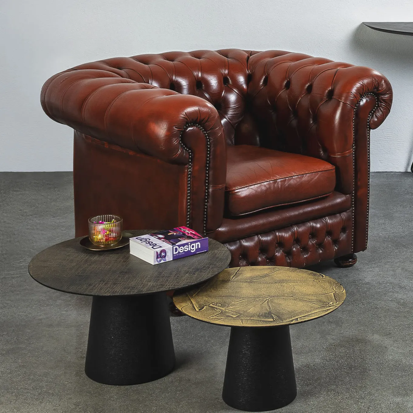 Aged gold leaf on spatulated bronze resin transforms this Fungo coffee table into a striking artistic piece. The richly textured surface glows under the light, emphasizing the hand-applied detailing that makes this table unique. Supported by a sculptural wooden base, this 100% handmade Italian creation blends ancient decorative traditions with modern sensibility, making it a sophisticated focal point in any living space. Each product is distinguished by a unique archive number displayed on an exclusive label, accompanied by a certificate of authenticity