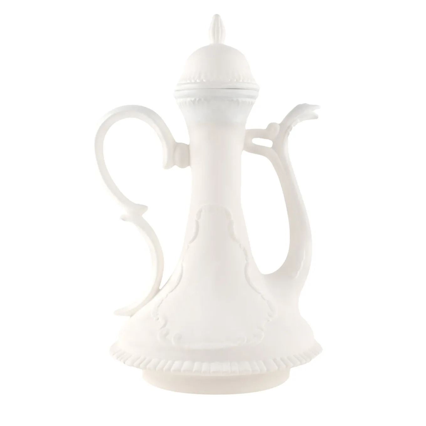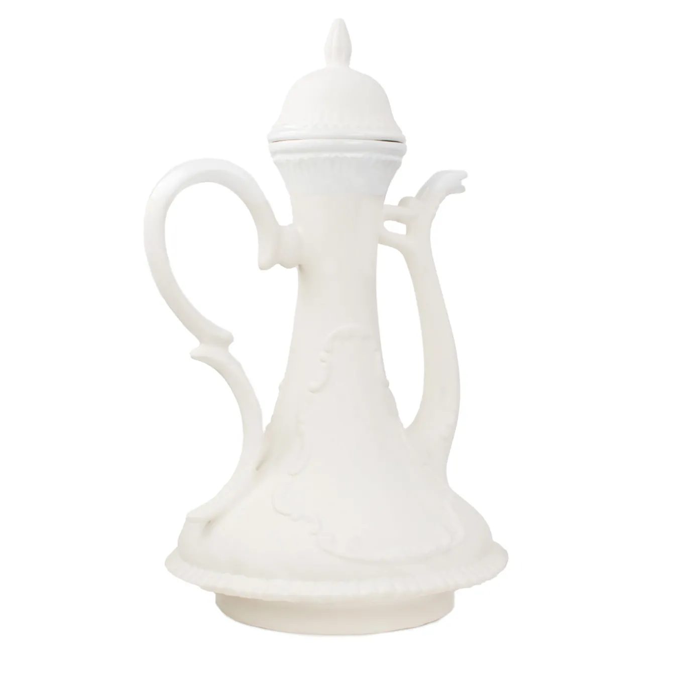 The Futura 03 ceramic coffee pot stands 50 cm tall and features a striking design inspired by baroque ceramics. Its sculpted surface combines raw biscuit ceramic with glossy white enamel applied selectively to the interior, handle, and dome-shaped lid, offering a refined contrast in texture and finish. The arabesque lines, sweeping handle, and detailed motifs evoke a playful yet contemporary reinterpretation of classic domestic forms. Designed by Paola Navone for LANDO, this piece is part of the Futura collection, which distills baroque excess into poetic and radical decorative objects. The coffee pot is available in additional height options of 40 cm, 32 cm, and 23 cm. Contact the Concierge for further information.