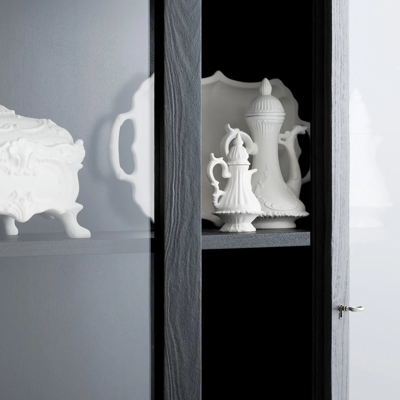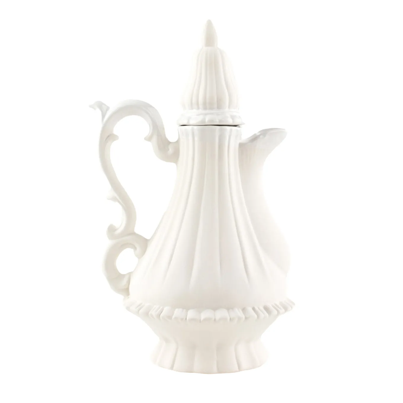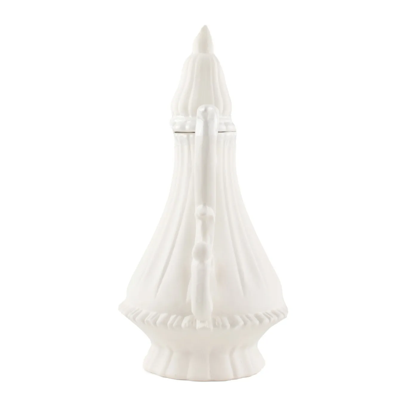 Inspired by antique coffee pots, the Futura 07 white ceramic coffee pot features a sculptural silhouette with baroque curves reinterpreted with subtle irony. Its partially glazed surface contrasts matte and glossy finishes, enhancing form through light and shadow. The elegant handle and pointed lid add poetic detail, while the undulating base evokes delicate lacework. Measuring 15 cm, this piece balances tradition with a contemporary, imaginative design approach. The coffee pot is available in additional height options of 22 cm and 31 cm. Contact the Concierge for further information.