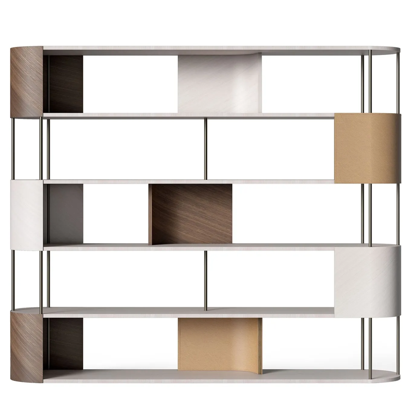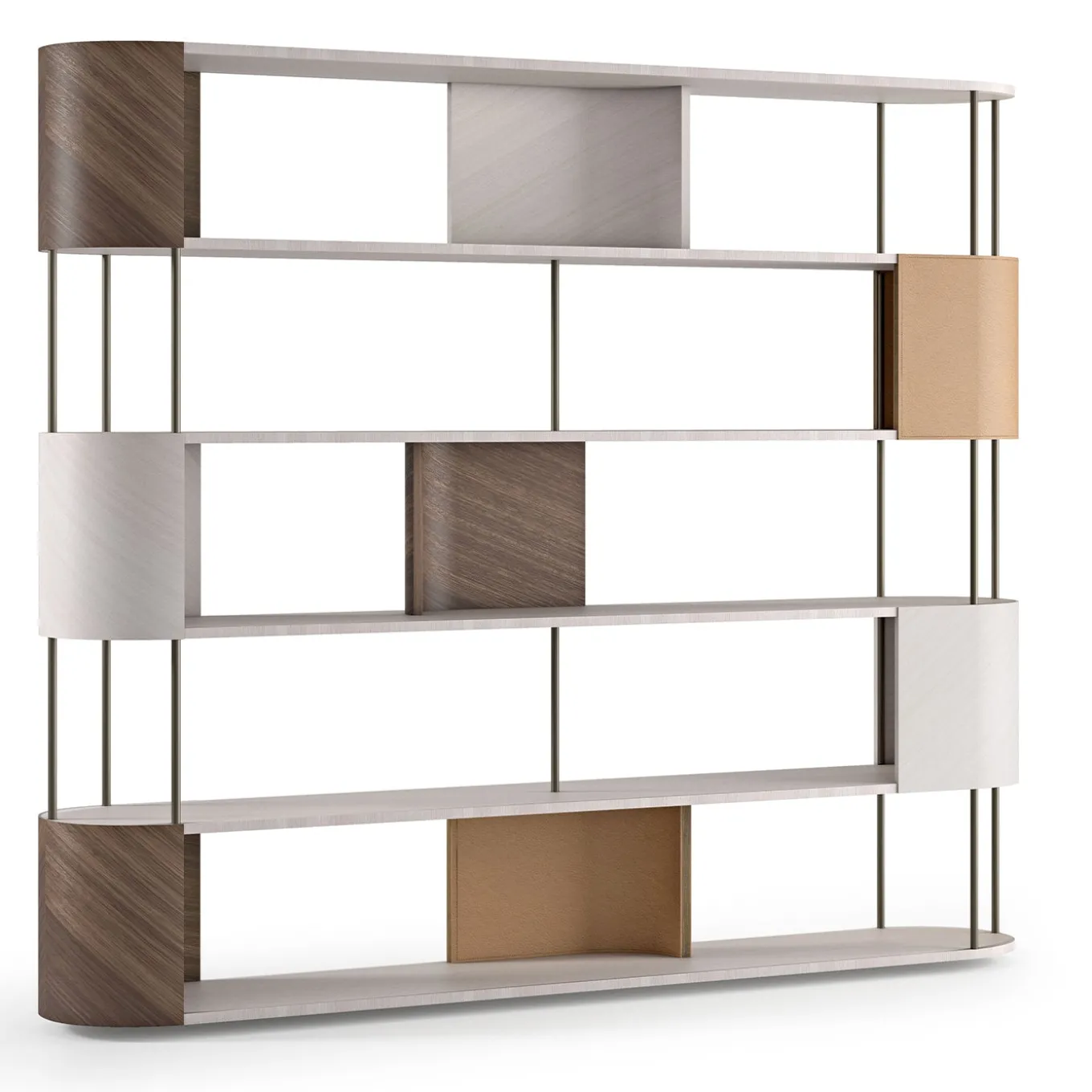 The unique volumetric identity characterizing Gae Aulenti Square in Milan inspired the proportions and lines of this stunning bookcase. Its airy design, resulting from the juxtaposition of five shelves supported by metal bars and accented with curved volumes finished in dark or light Tay, Canaletto walnut, or leather, favors a freestanding display of both functional and decorative charm. Please contact the Concierge for modular and customized options.