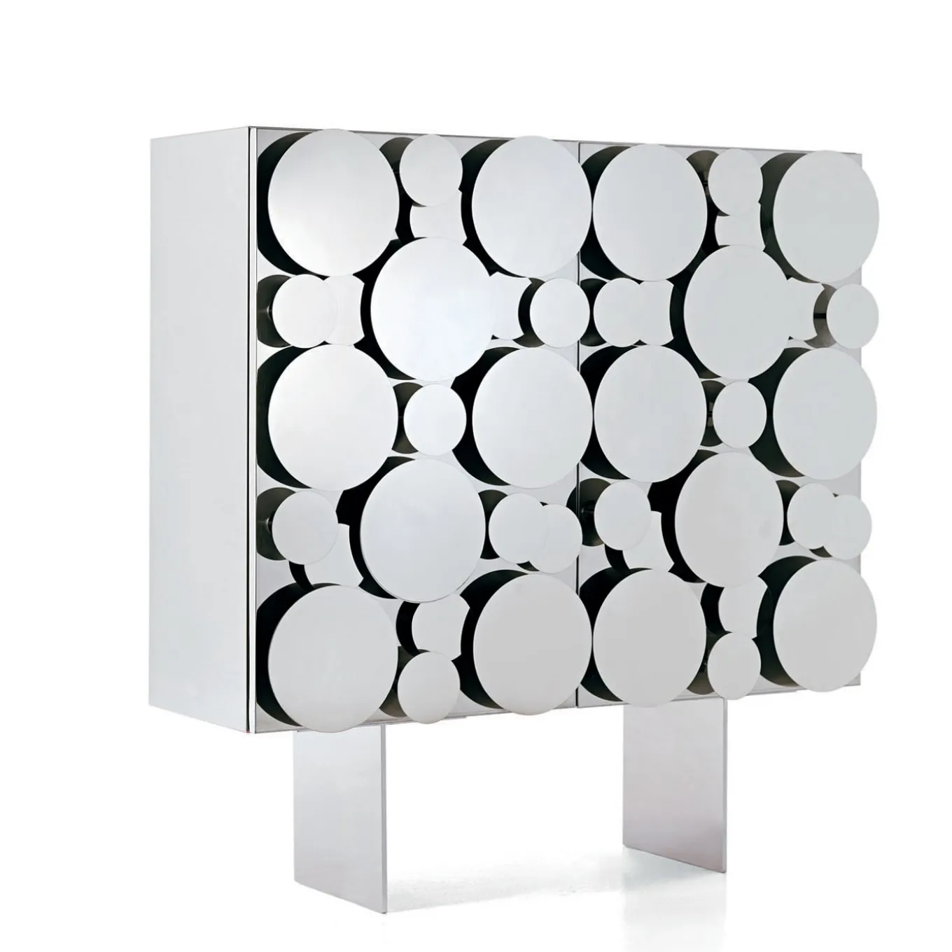 This striking pantry is made of an especially resistant combination of wood fibers and resin pressed at a high temperature. It is finished in pink lacquer and it features a cabinet with two crystal shelves inside. The structure is in stainless steel with a geometric pattern of steel circles adding texture to the front of the piece. Assembly required.