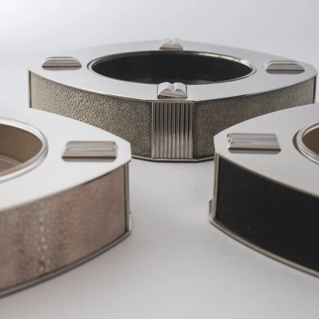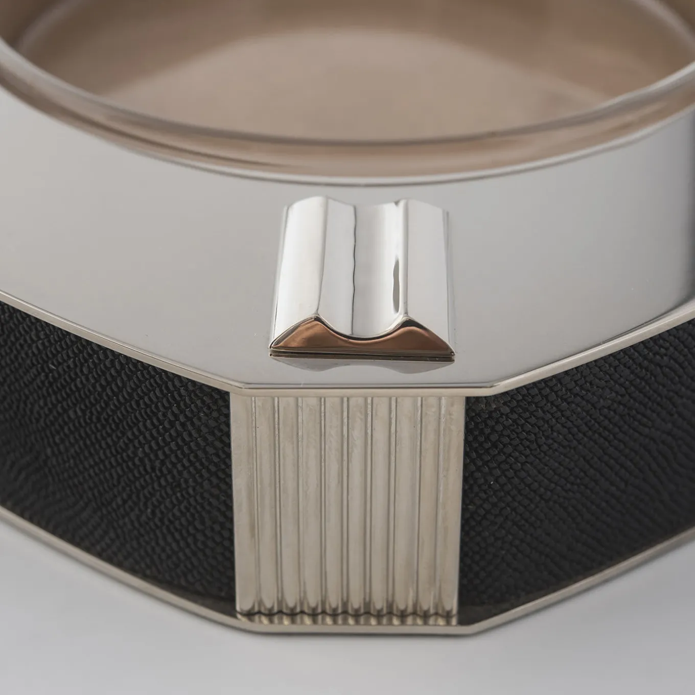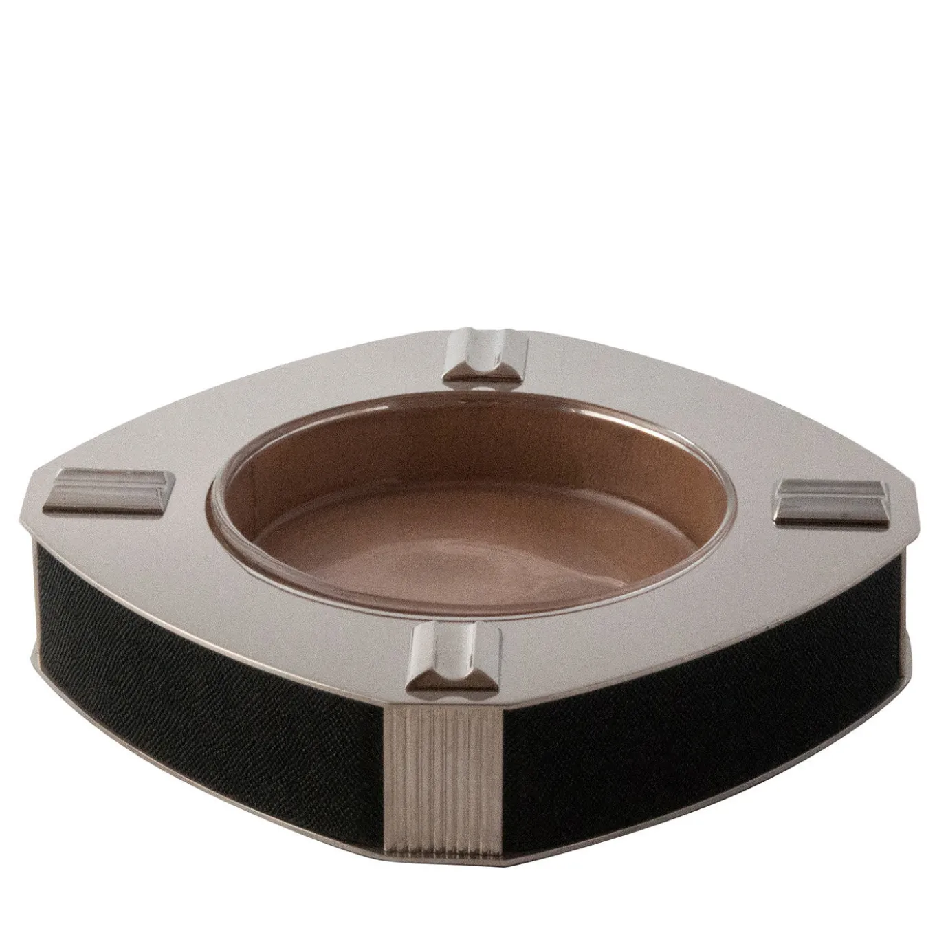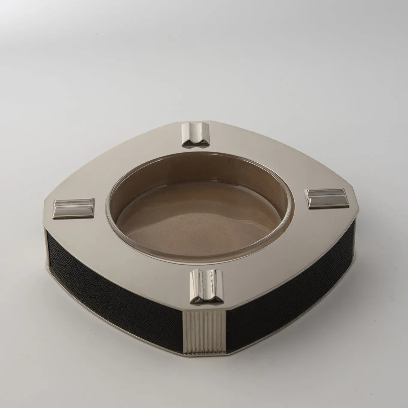 Reminiscent of Art Deco glamour, this ashtray is designed and made entirely by hand by Nino Basso and belongs to the Galucharme Black Collection of accessories for the desk and home décor. Framed in black shagreen, the square shape is handcrafted of polished nickel-plated brass with 4 cigar/cigarette support notches on the corners and a removable glass tray (Ø 12cm) for easy cleaning. Ready to be gifted, this luxury item comes in a black box (19x28xH.7cm) with a care instruction booklet.