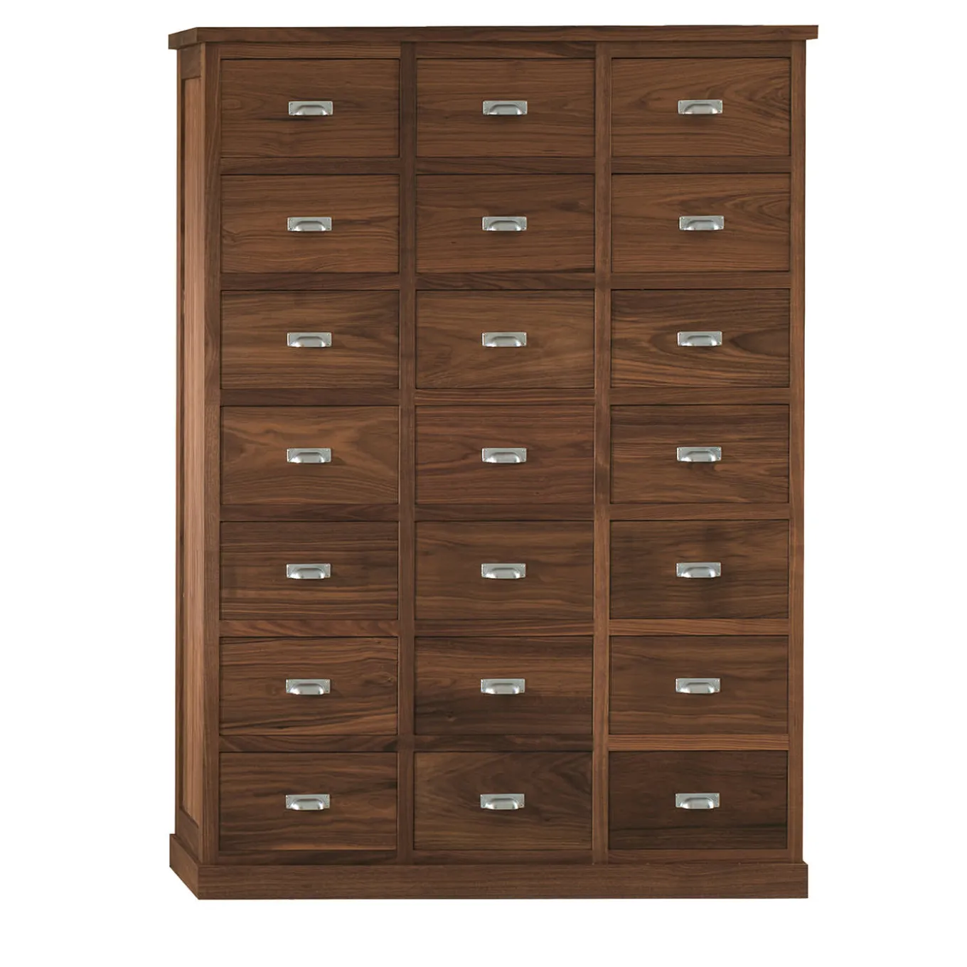 Finished with oil nourishing the wood and enhancing its natural grain, this chest of drawers is a superb solution for decluttering offices and personal rooms. Twenty-one drawers equip the sturdy knot-free walnut structure, showcasing an unadorned design that favors the focus on its unrepeatable and unpredictable natural traceries.