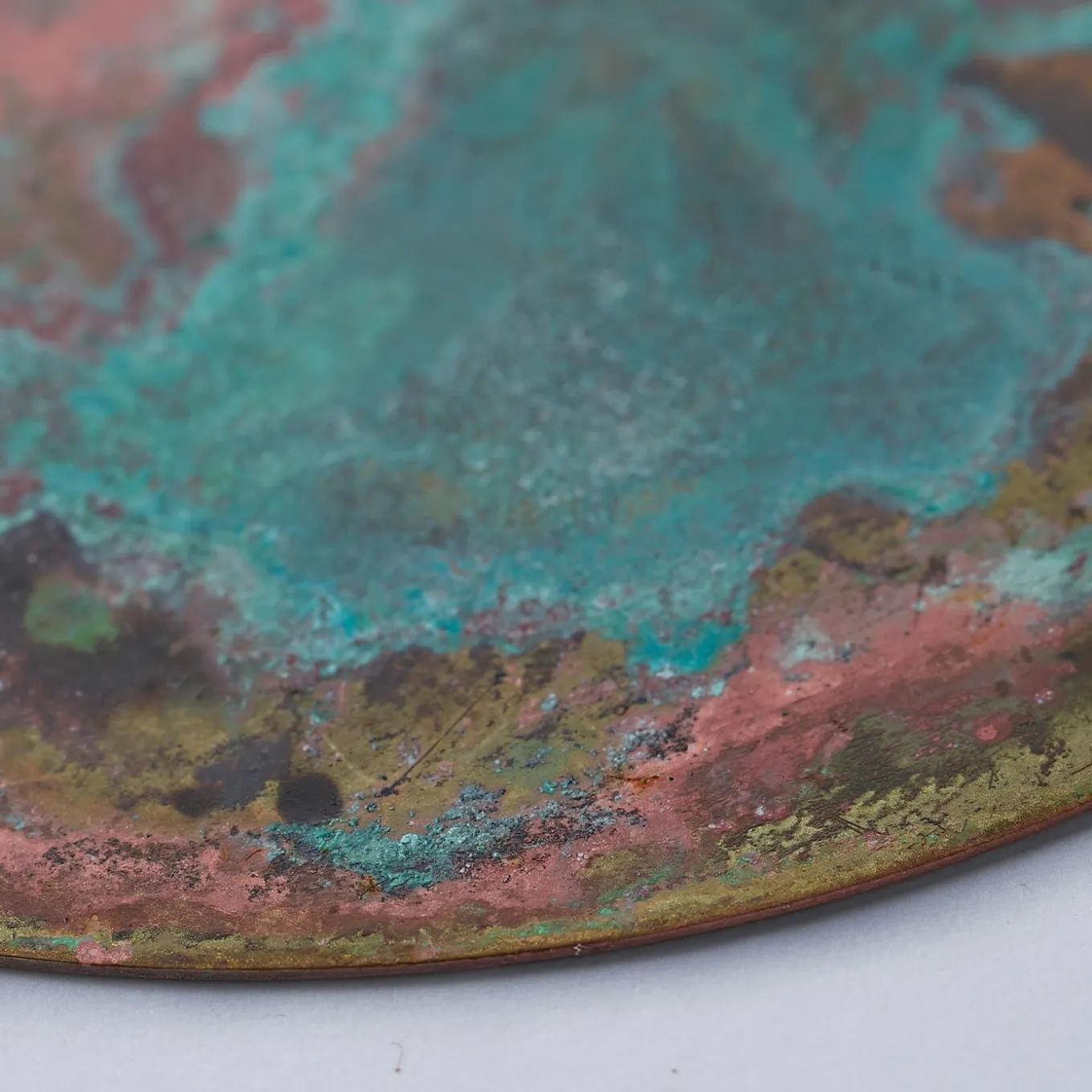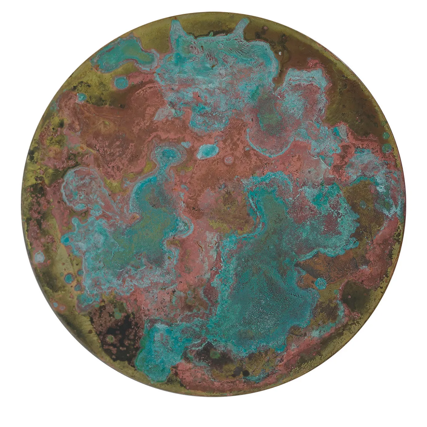 This set of six coasters is distinguished by a vibrant interplay of teal, burgundy, and green clouds accented with a dynamic corroded texture. Fashioned of brass, the pieces get handcrafted step by step, the treatment with acids and oxides lending them their singular look. Each coaster is protected by antioxidant layers and equipped with a velvety cover at the back for impeccable grip.