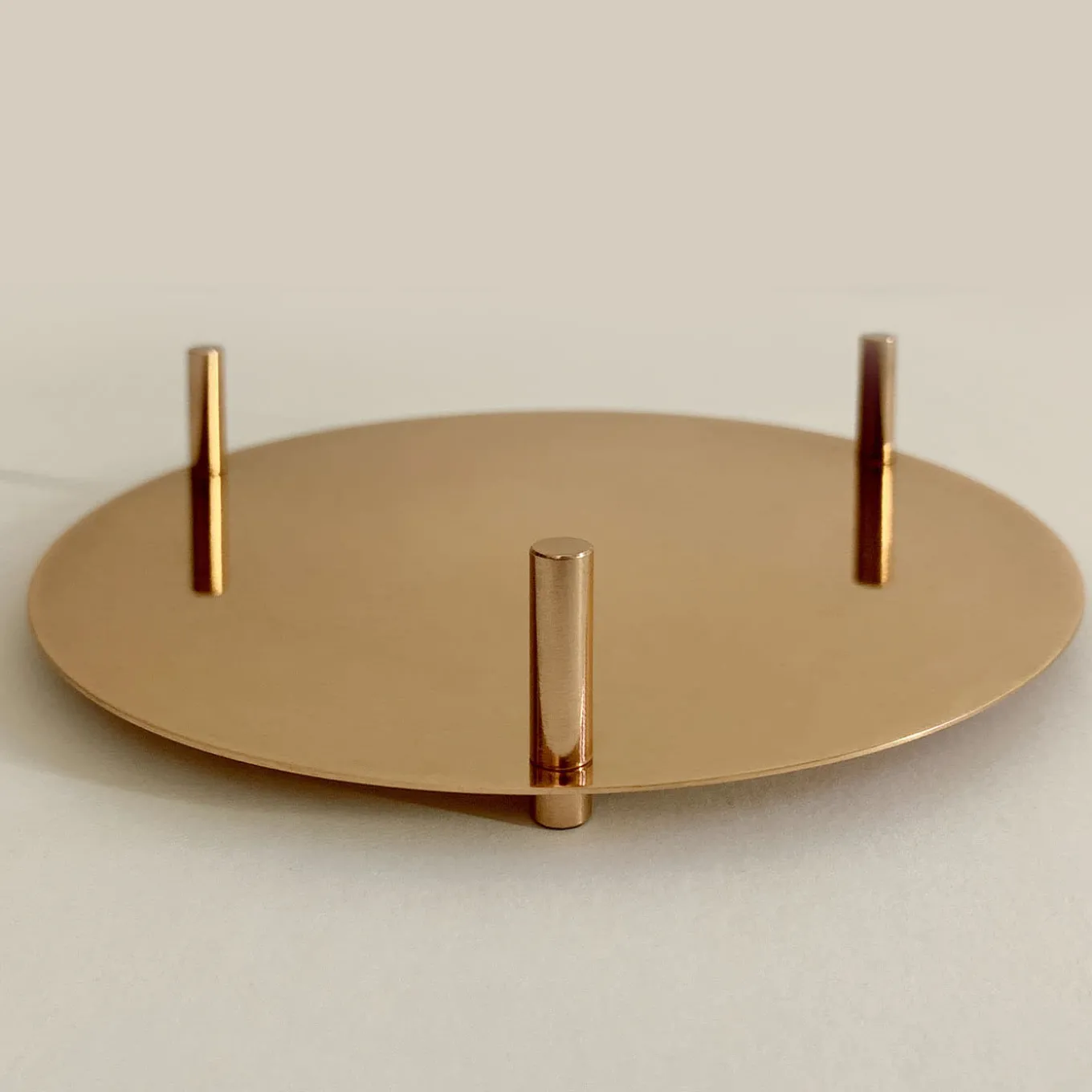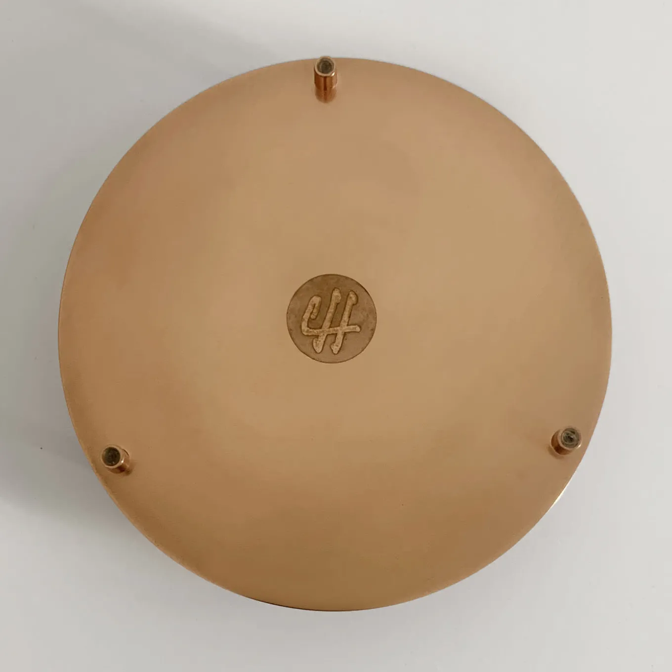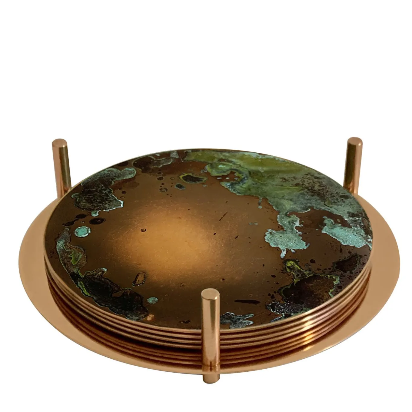 A superb addition to contemporary tables, this set of six coasters stands out for the unpredictable hues and abstract traceries caused by oxides when reacting to copper. Each piece is crafted by hand and unique, their surface protected by an antioxidant treatment to prevent corrosion and their back covered with a velvety material for optimized grip. Other designs are available in the Artemest catalog. The brass container is included in the price. The disc diameter is 12 cm, the coaster holder is 15 cm, and the height is 5 cm.