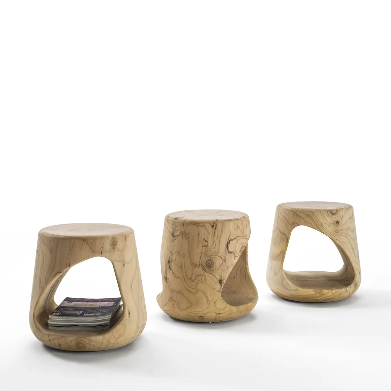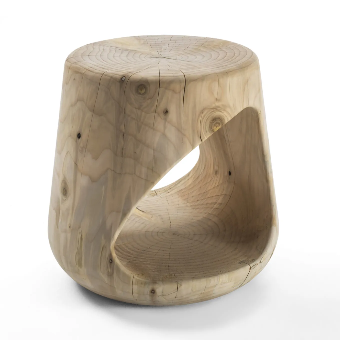 Celebrating wood in its natural essence, this splendid stool is a singular design by Marco Baxadonne. Handcrafted from a single block of solid cedar wood, exuding a fascinating scent, it features a sinuous and soft shape distinguished by an open compartment of multifunctional character. This stool can also be used as a side table.