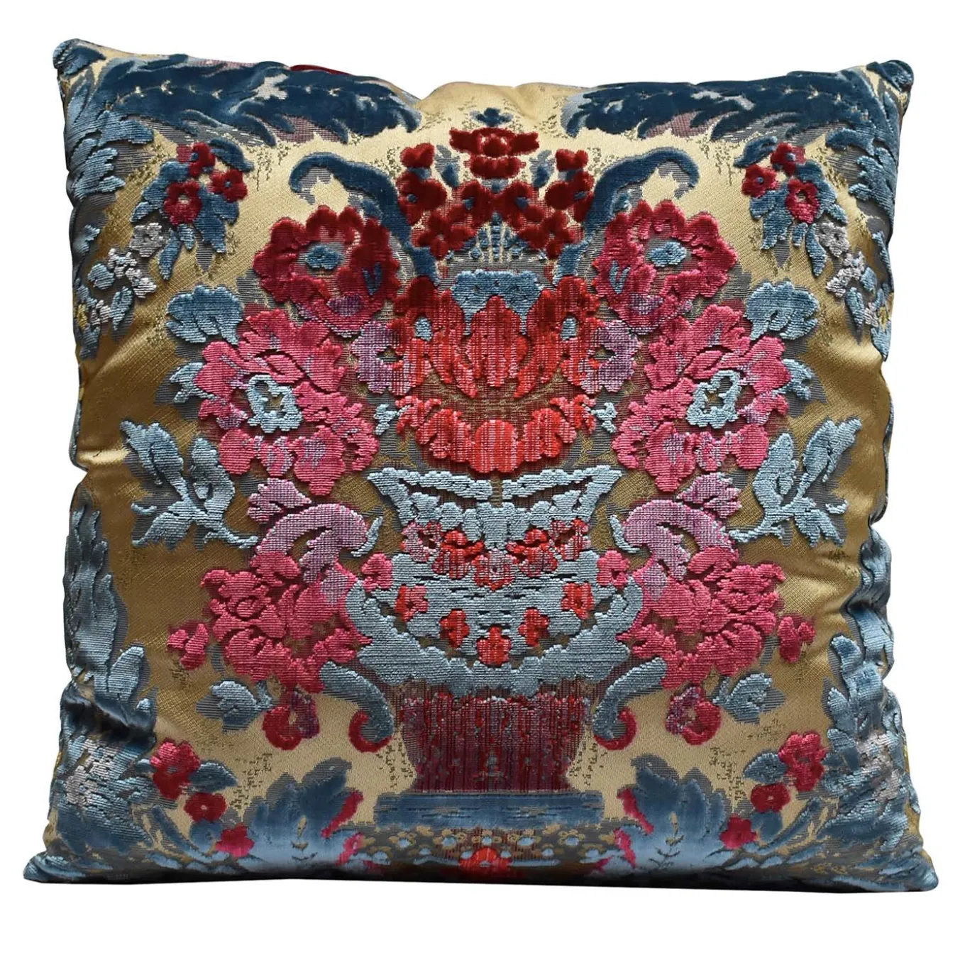 This pillow is a refined combination of color and form and will make a striking addition to traditional interior decor. Made using fine velvet from the “Giardino Antico” Collection, it boasts a lively composition of a basket of red flowers, enhanced by the ivory background. The cushion is lined and features a zipper closure.