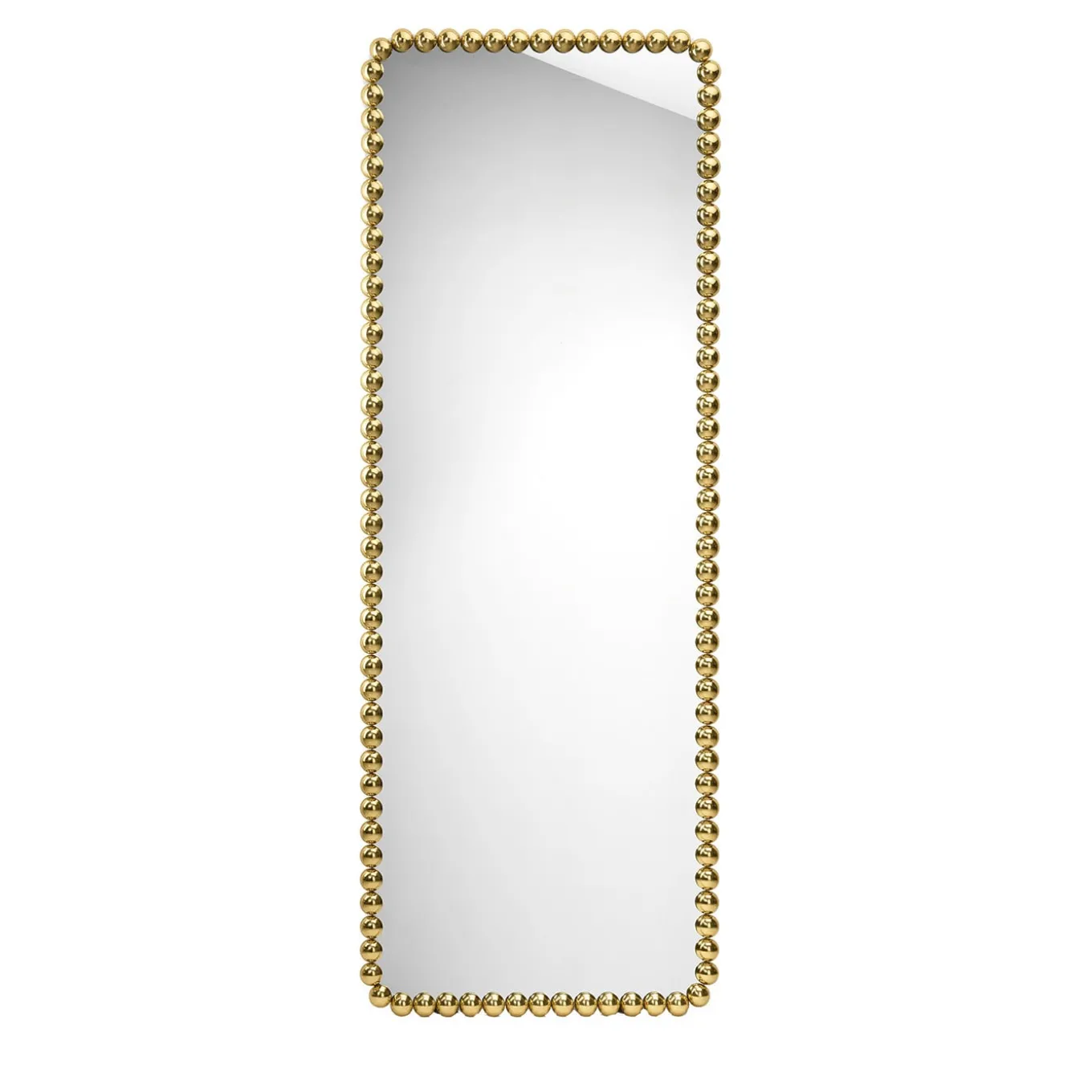 A lavish and contemporary free-standing mirror designed by Nika Zupanc for the Gioiello series, this piece will make for a stately and bold addition to a contemporary-style interior. Singular and iconic, it is distinguished by a rectangular frame of polished gold-finished brass spheres. It is also available in black and chromed finishes as well as other shapes, please consult the Artemest catalog for options.