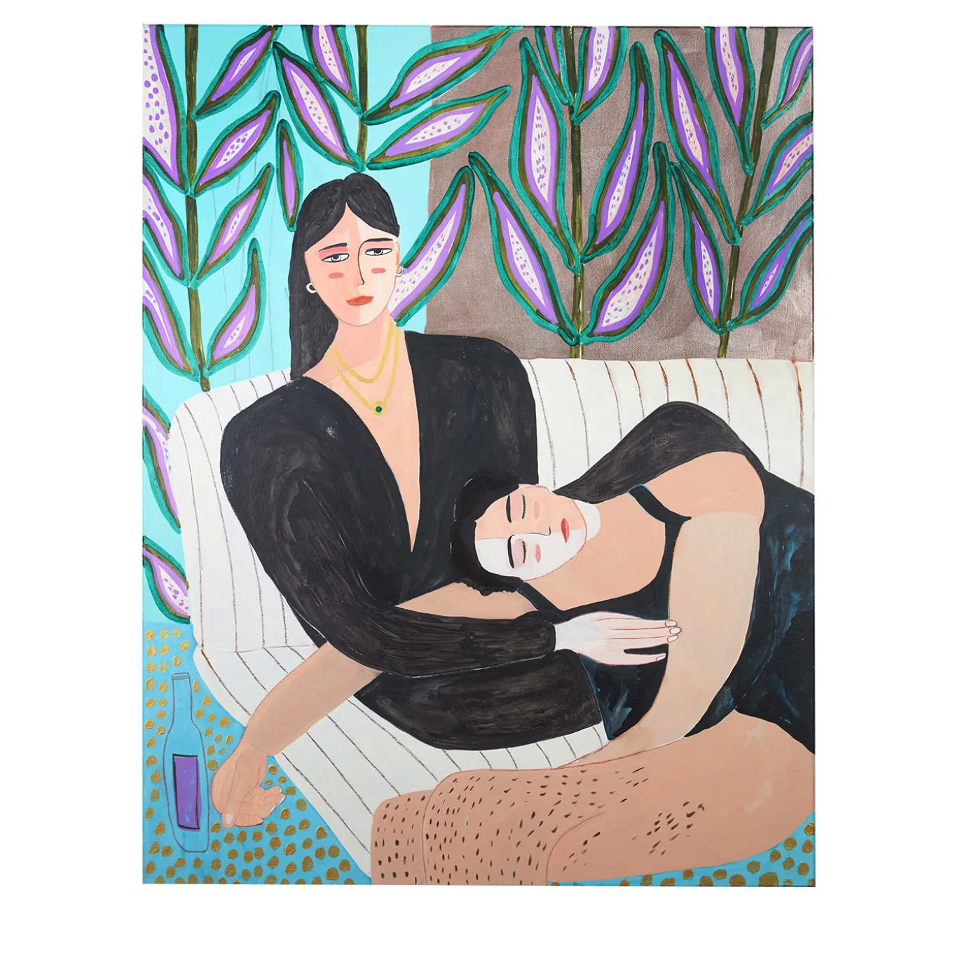 The flat brushstrokes and acid hues featured in this mixed-media painting on canvas depict a scene where a man sleeps relaxed on the lap of a woman, her gaze at once calm and worried. Stylized plants and flowers in the background symbolize dynamism and vitality, counterbalanced by the still pose of the woman in a black dress that delivers a sense of seduction and strength.