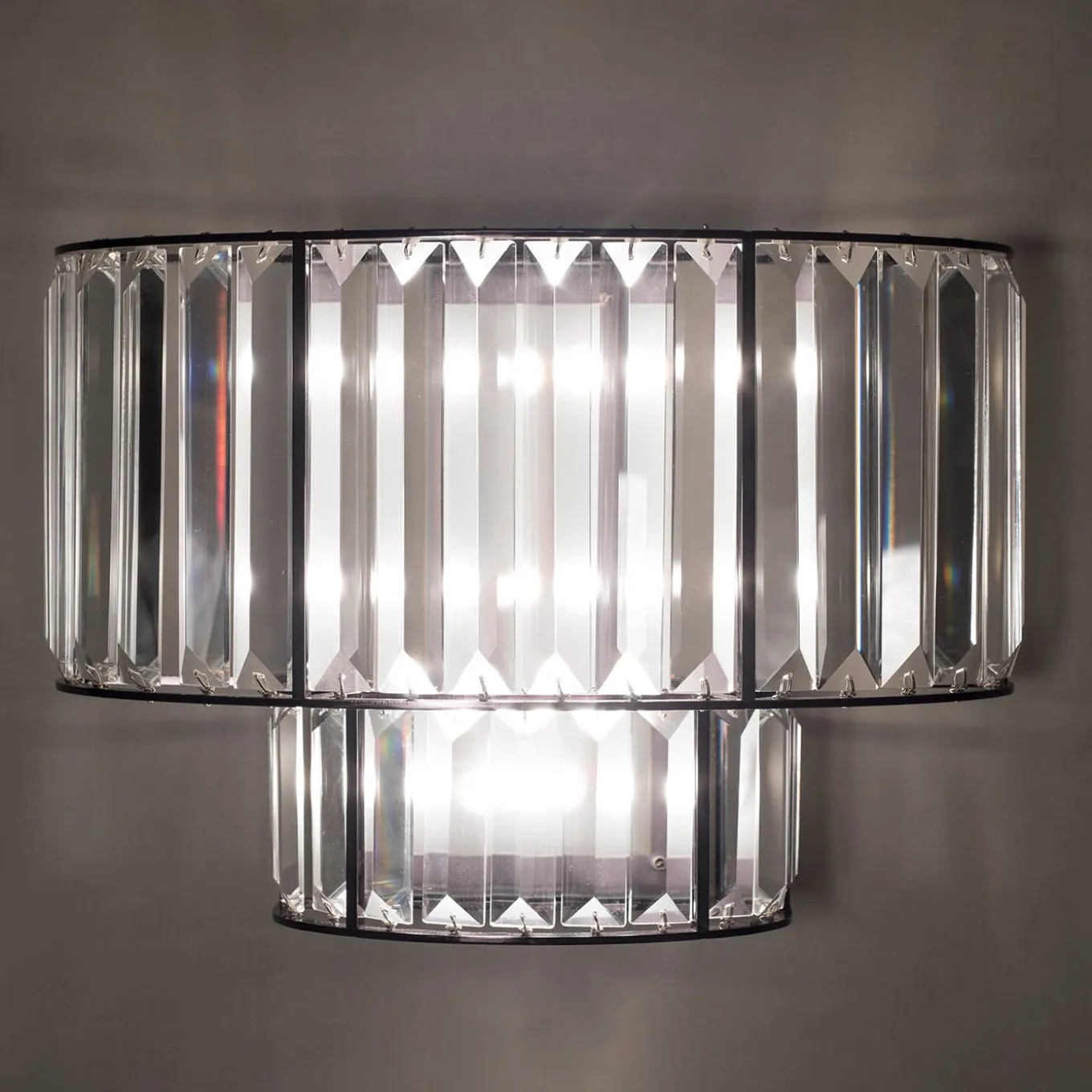 Crystals and a chrome plating are combined together to give emphasis to a geometrical and complex system, composed of modular elements. Gisele lamp offers multiple declinations, like a choreography of bodies in space. An innovative design inspired by art dèco, which combines new technology with aesthetic reasons: the entire structure is created in steel with a laser-cut and the lights are dimmable leds. Led wall lamp, led stick 24VDC – 15W, 3000°K supplied, dimmer wifi included.