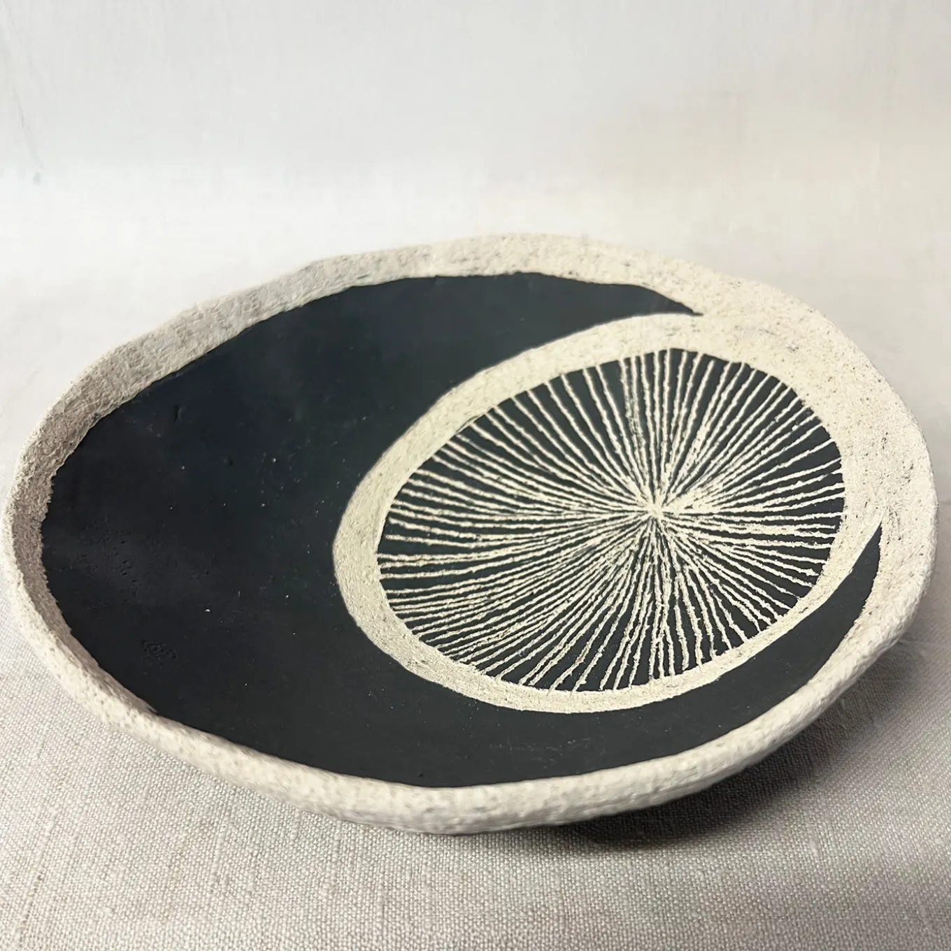 A mesmerizing circular engraving radiates from the center, forming an intricate sunburst pattern against the deep black ceramic. This hand-painted and carved bowl is sculptural and functional, serving as a decorative accent or a refined catchall for everyday essentials. Its textured contrast and handmade imperfections celebrate the beauty of craftsmanship, making it an elegant and unique addition to any curated interior.