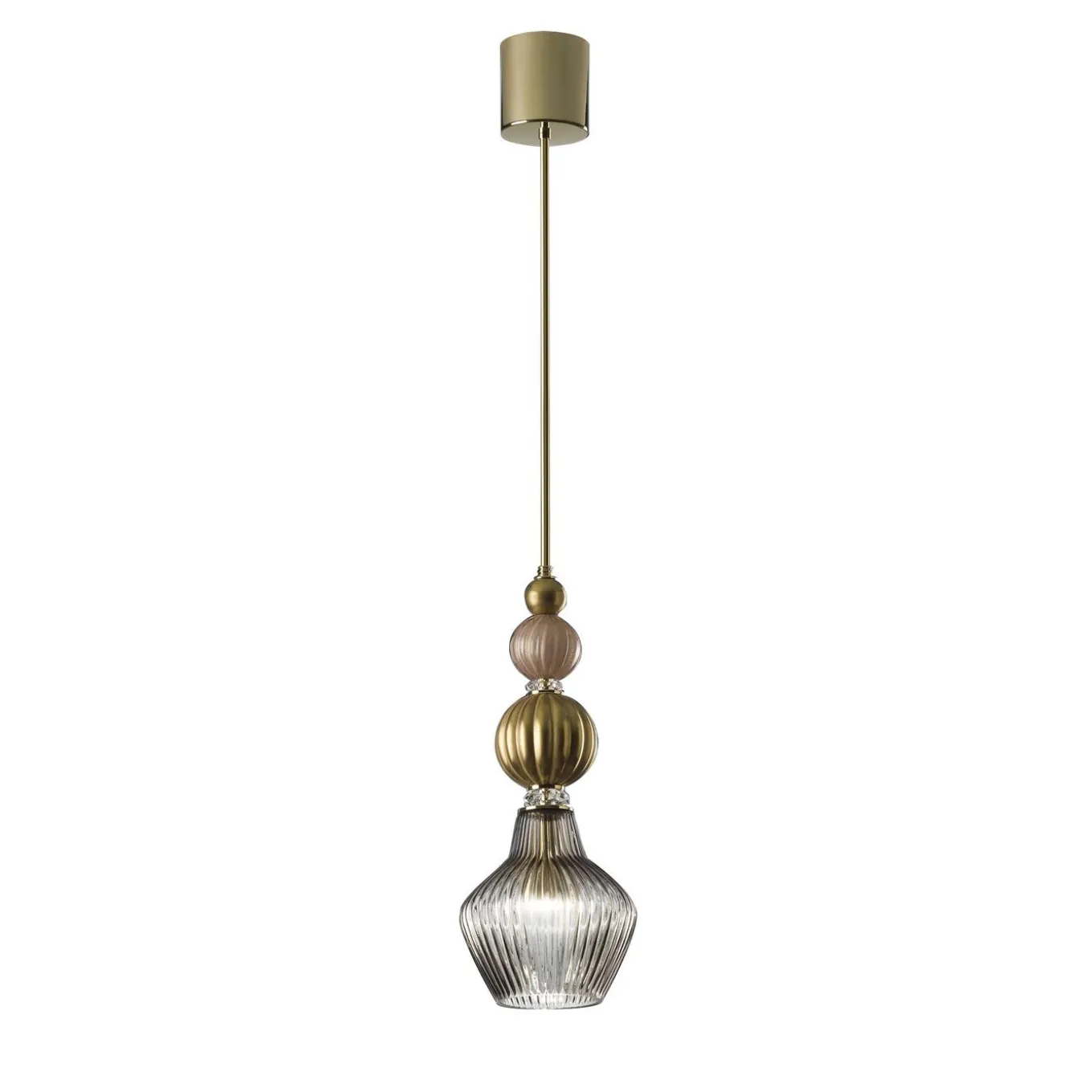 A masterpiece of elegance and artistic craftsmanship, this pendant lamp is a stunning piece of functional decor. Its vertical stem in brass (adjustable and max 200 cm high) is adorned with a stack of porcelain spheres embellished with delicate grooves on the surface. The shade in mouth-blown Murano glass completes this exquisite work of art, part of the Divas Collection.