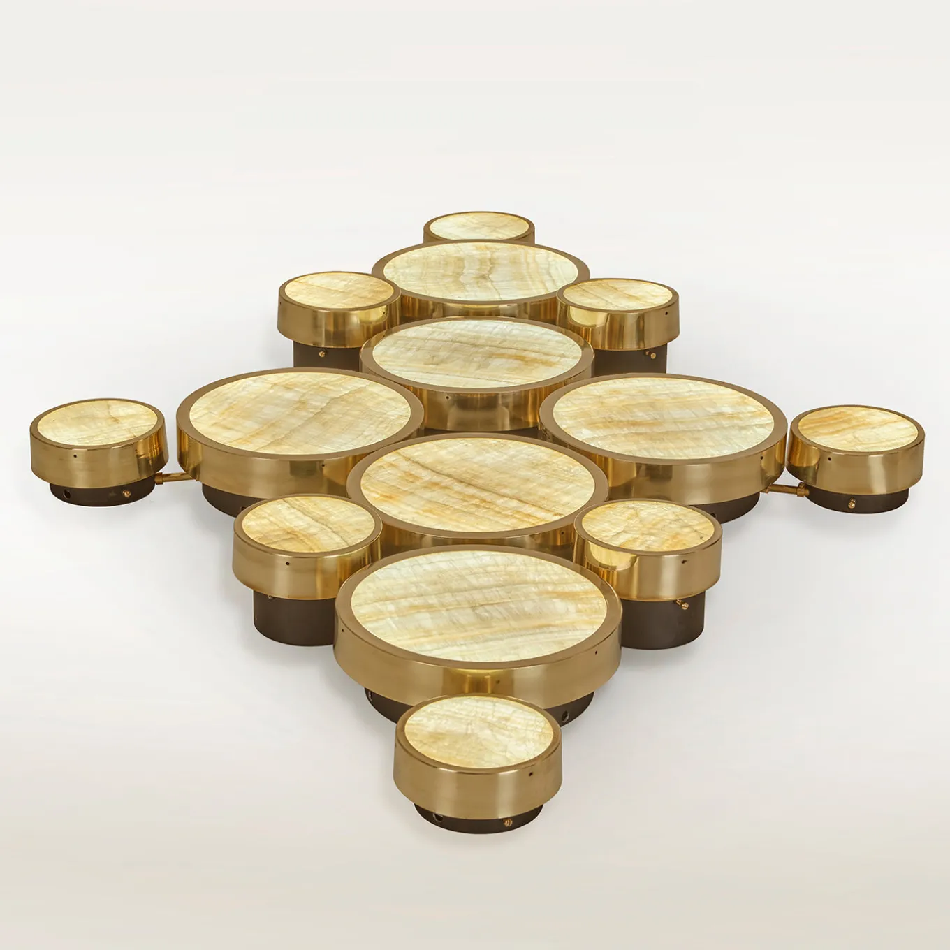 Gemini, part of the Gran Costellazione series, is a large flush mount chandelier featuring six large and eight small circular elements arranged in a fractal pattern, inspired by the Gemini constellation. Measuring 121 x 85.5 cm (48 x 34 inches), it combines onyx diffusers within brass frames to deliver a sculptural design with ample light output. Designed to illuminate spacious areas without obstructing views, it uses high-efficiency LED technology providing up to 20,000 lumens, dimmable with standard residential triac dimmers. Custom finishes and materials available on request, contact the Concierge for more details.