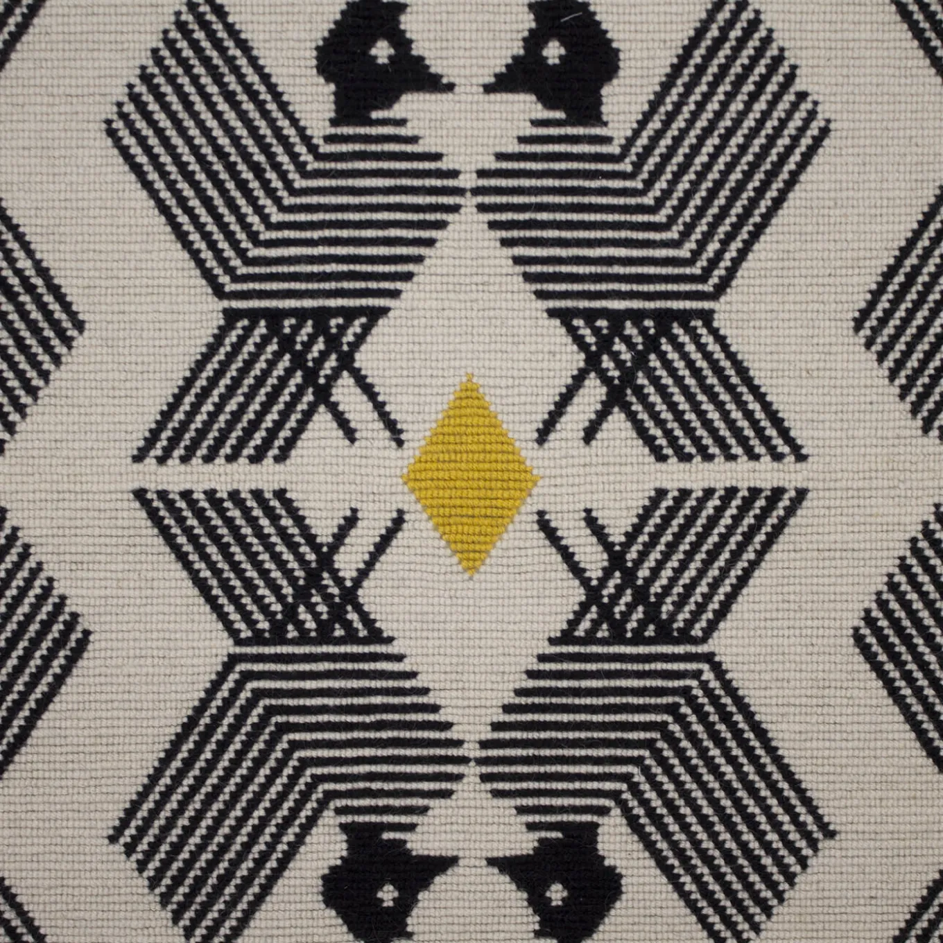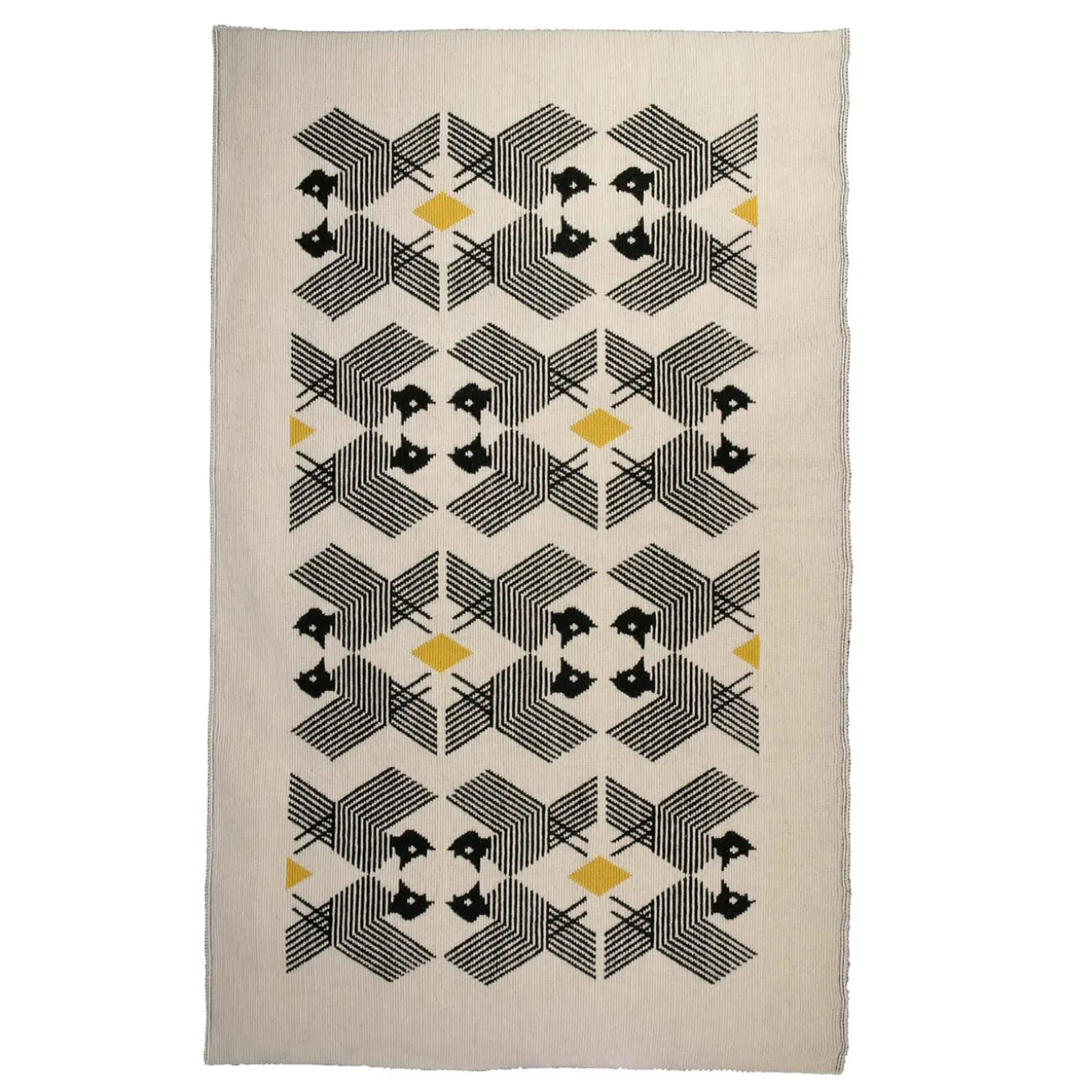 Weaving mastery and mythological references merge in this one-of-a-kind rug designed by Maurizio Demelas. Crafted by following the Sardinian ancient “pipiones” technique, the black pattern of stylized griffons – heraldic, chimeric symbols of safekeeping – is dotted with yellow rhombuses and emerges from a bright beige backdrop. The design distills a sense of power and ferocity.
