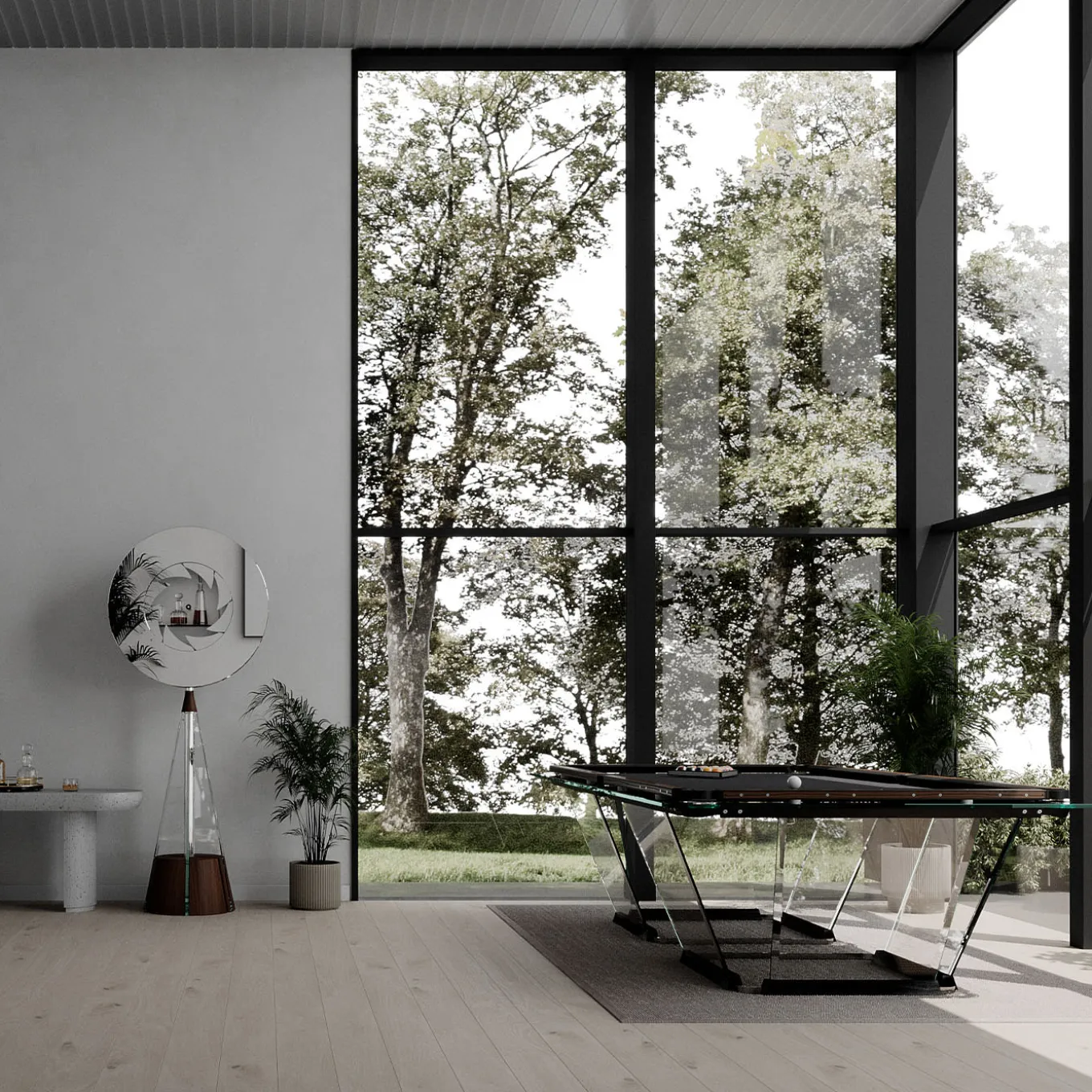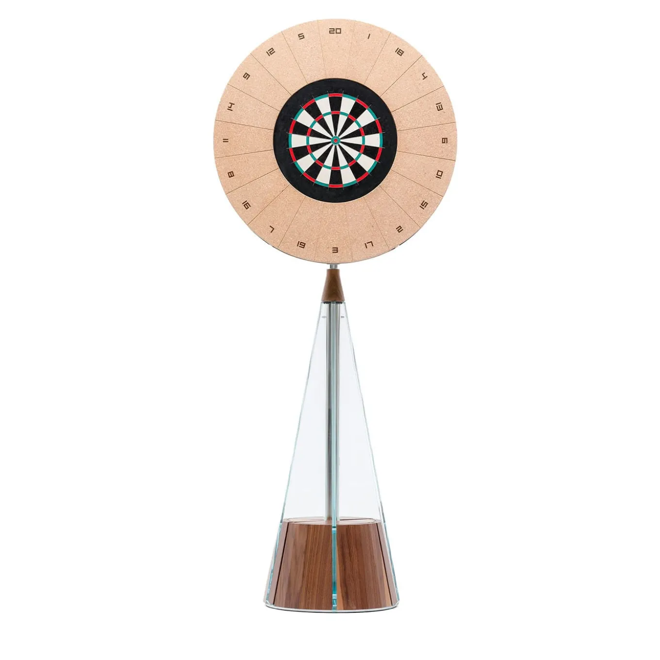 Gualtiero is a dual-sided indoor piece blending function and style. Side A, Cabinet of Curiosities, features a circular mirror that opens via a side knob, revealing a 50 cm compartment with a 15 cm deep shelf, ideal as a bar cabinet. Side B, Darts, is a playable dartboard with a cork frame, tempered glass, and wood. Made of Canaletto wood with steel and glass details, it is also available in black ash with an open-pore finish. Includes a dart set, magnetic laser, and Teckell toolkit. Contact the Concierge for more information.