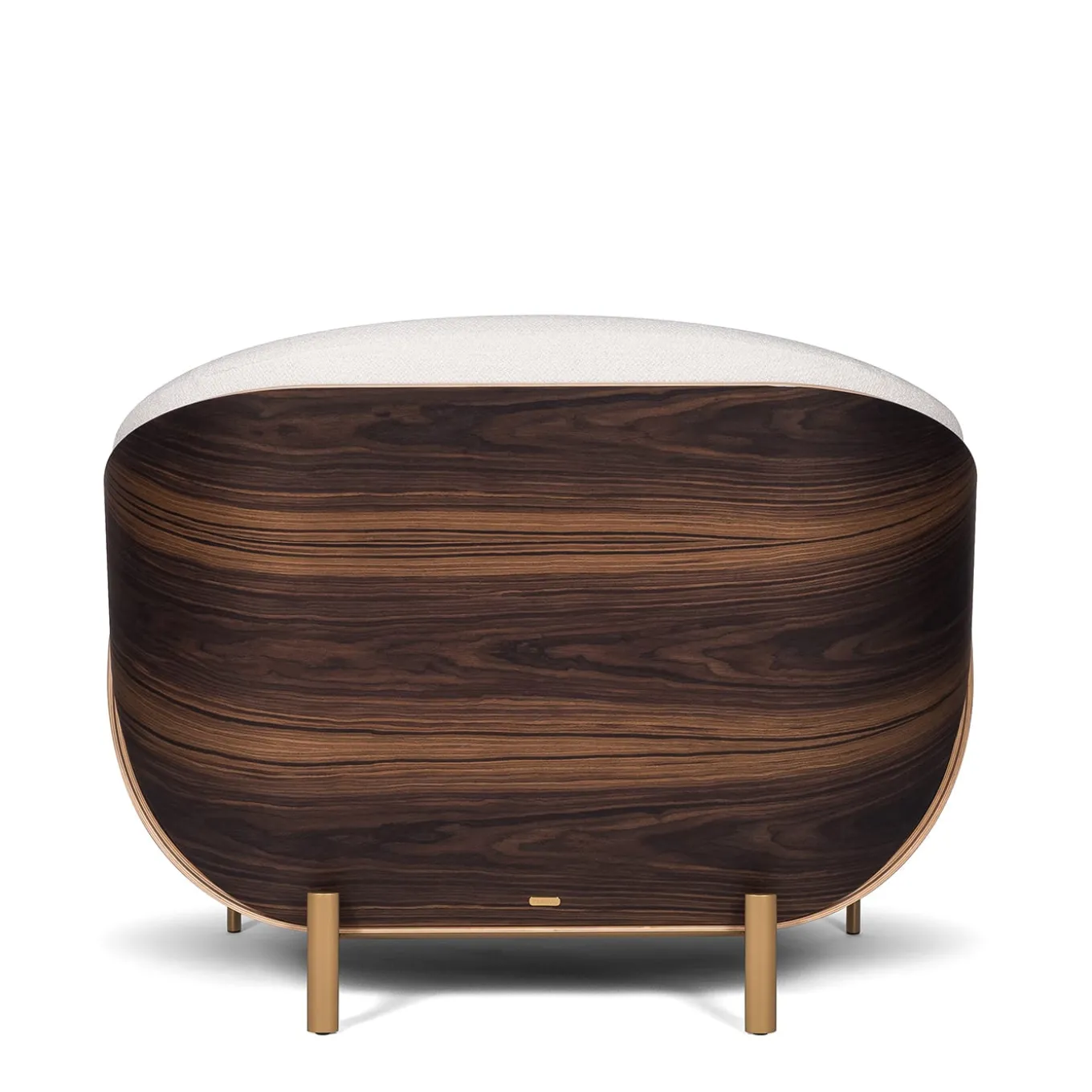 The Haima’ armchair was co-created by FROMM. X Maryam Al Suwaidi. This armchair embodies Italian craftsmanship with its characterful curved shell inspired by a tender embrace. Every detail, from the backrest to the armrests, is meticulously crafted for ultimate comfort and elegance. The intriguing grain patterns of the wood add a touch of natural refinement to this exceptional piece. Haimà will shine in any interior, bringing style and sophistication to any living space. It is covered in Bouclé Fabric. It is sold with one pillow.