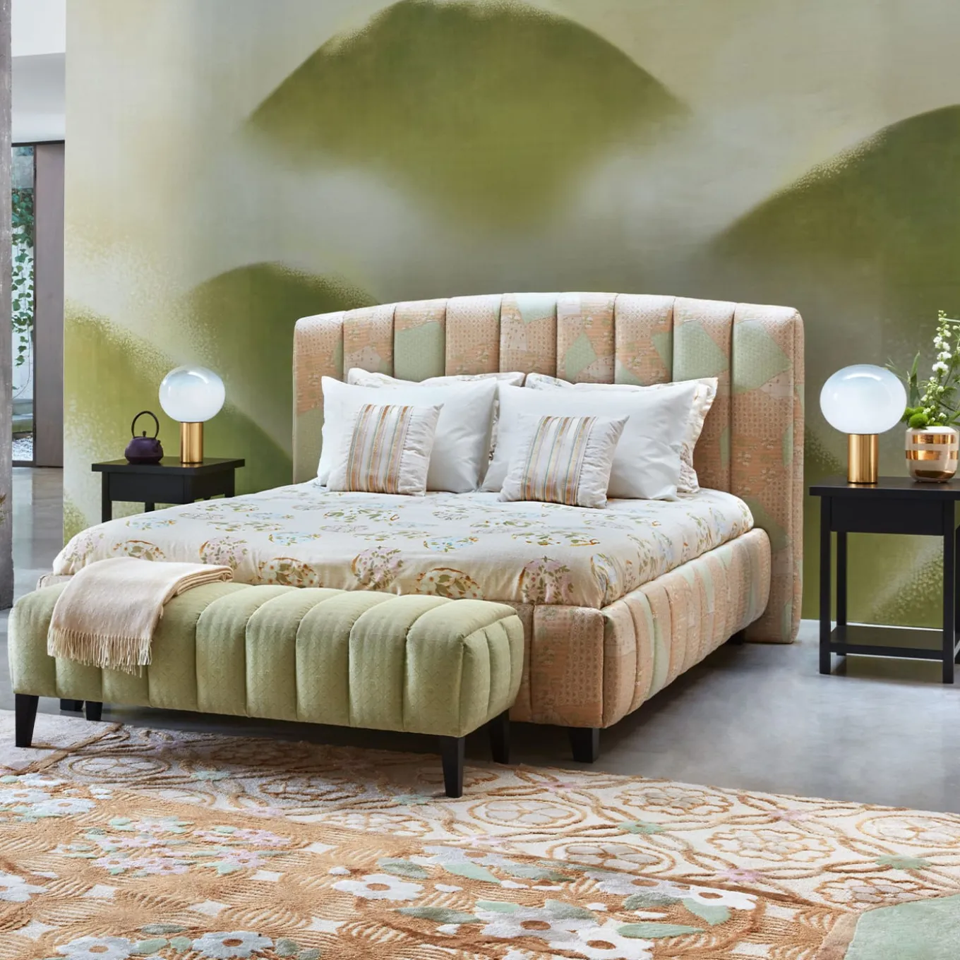 An eclectic addition to any living space, the rug is hand-tufted from the finest wool and viscose. Rendered in a delicate palette of pale natural hues, the rug features a simple yet dynamic patchwork of embossed flowers whose panels are delineated by a kintsugi, a tribute to the ancient Japanese art of repairing broken pottery with gold.