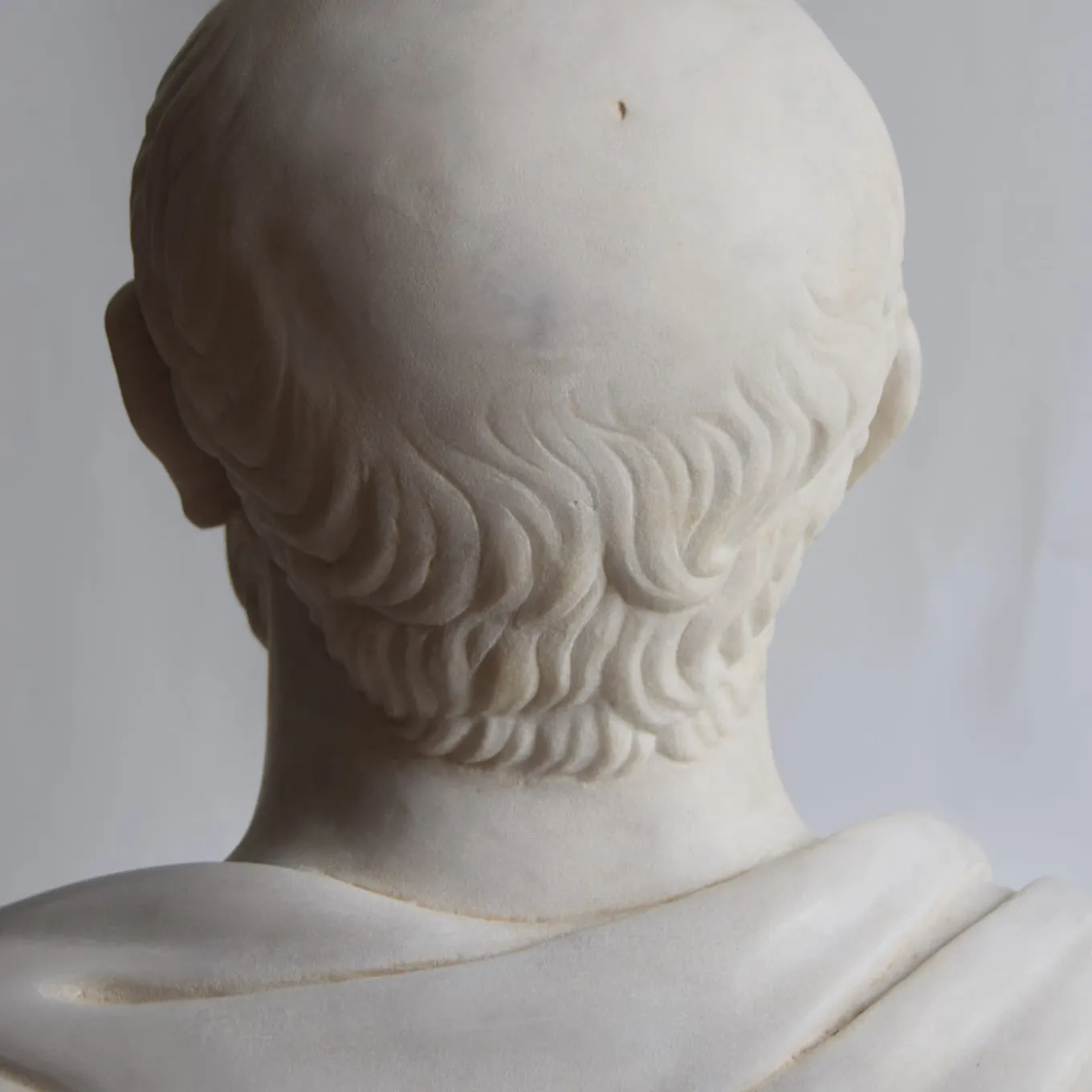 Minutely sculpted of white Carrara marble, this anthropomorphic bust faithfully reproduces the features of renowned Greek physician and geographer, Hippocrates. Considered the father of medicine, he is credited with coining the Hippocratic Oath, an oath of ethics historically taken by physicians and doctors.