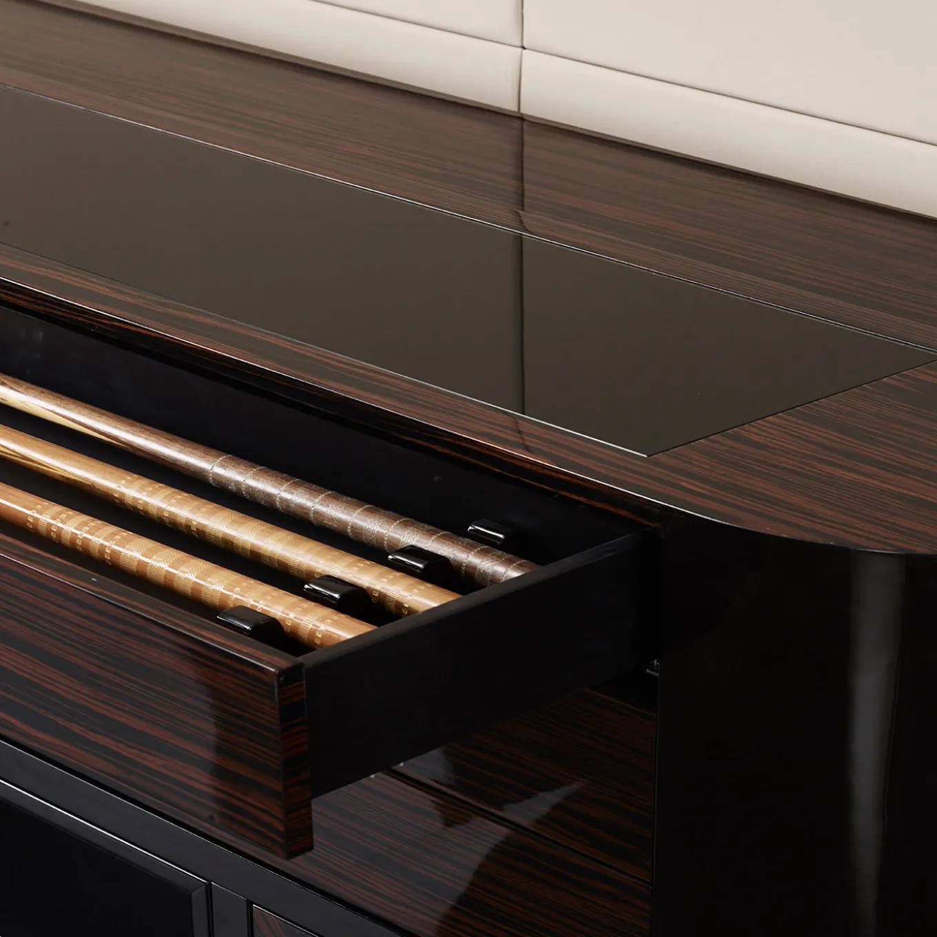 This elegant sideboard in glossy Makassar ebony, dedicated to the world of billiard and cigars, presents prestigious solutions both in manufacturing and design. It is equipped with compartments, drawers, a Bose minimal soundbar system, a multimedia system with an exclusive tablet PC and a ball holder, which are inserted in the electrically operated retractable area.