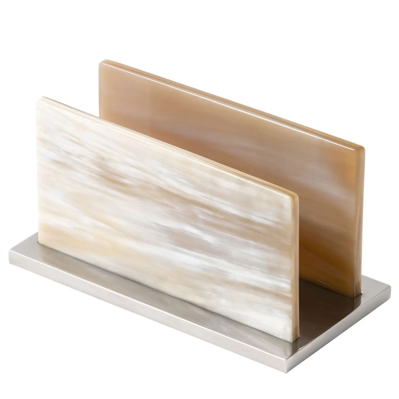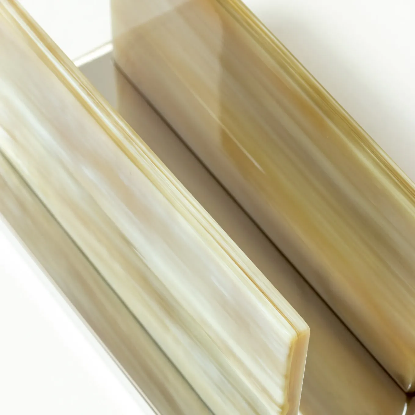 This elegant piece of functional decor is a precious addition to both a classic and a contemporary interior, where it will be a striking and useful letter holder in an entryway or on a desk – either at home or in an office. The brass rectangular base (either with a nickel or gold finish) was worked with the innovative technology of Computer Numeric Control and supports two elements in horn that were crafted by hand and finished with natural wax. This translucent, natural material adds a one-of-a-kind precious touch to this piece. Part of the Leonardo Collection.