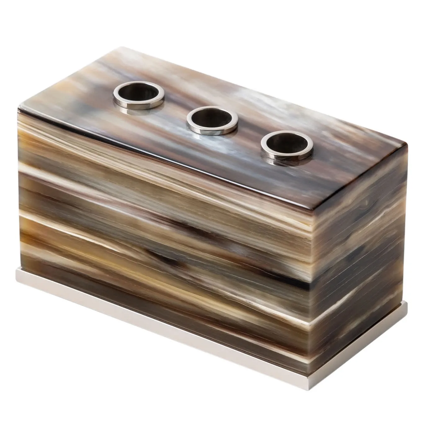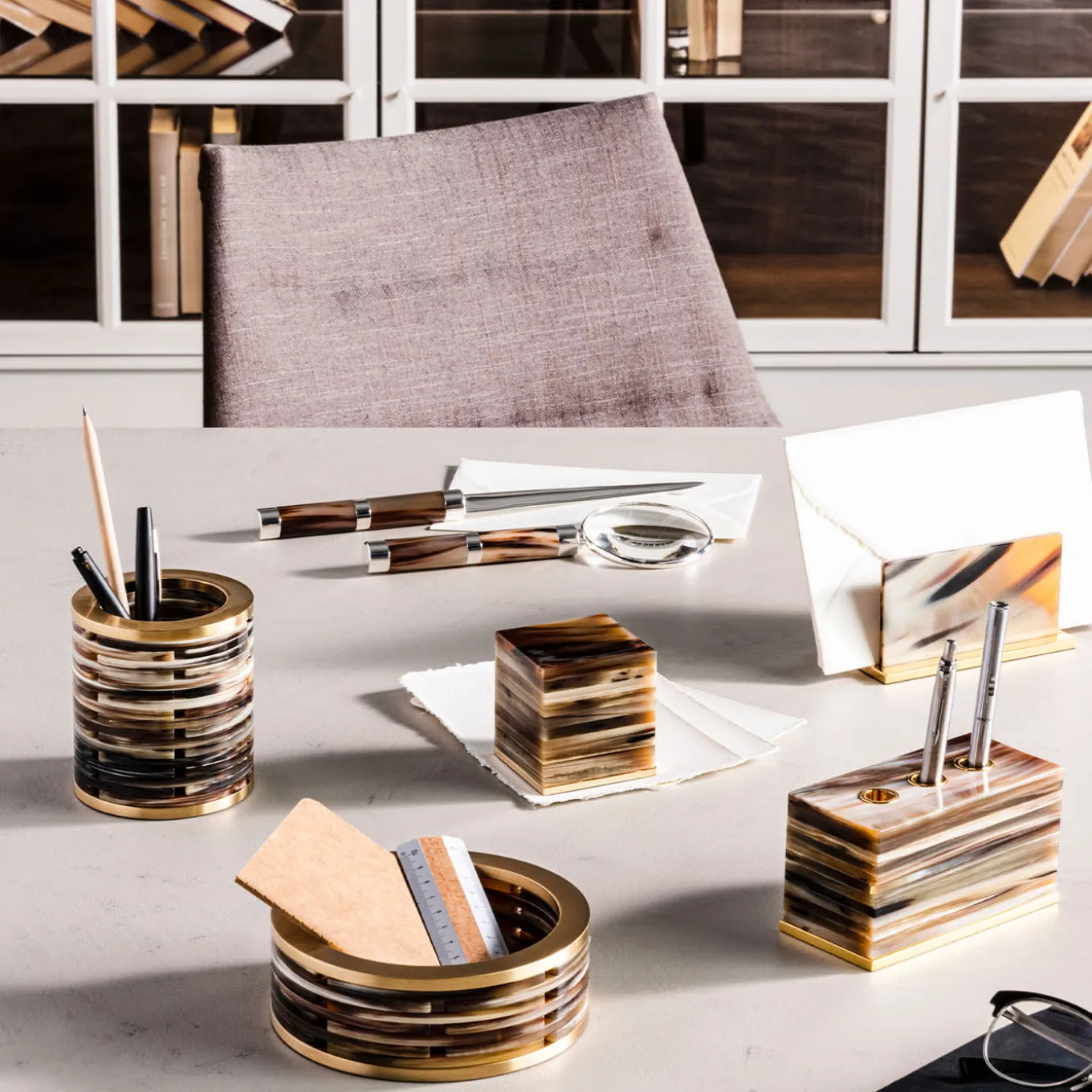A lavish addition to a desk, either at home or in an office, this pen holder showcases a rigorous silhouette enriched with natural horn that was crafted entirely by hand and finished with natural wax polish to preserve its quality. Its simple rectangular shape enhances the distinctive black, ivory, and golden-brown veining of the prized material, complemented by the nickel-finished brass of the base and accents. An elegant choice to display and keep pens organized, this object of functional decor is an elegant accessory with a modern edge that will blend effortlessly with any interior. Part of the Leonardo Collection.