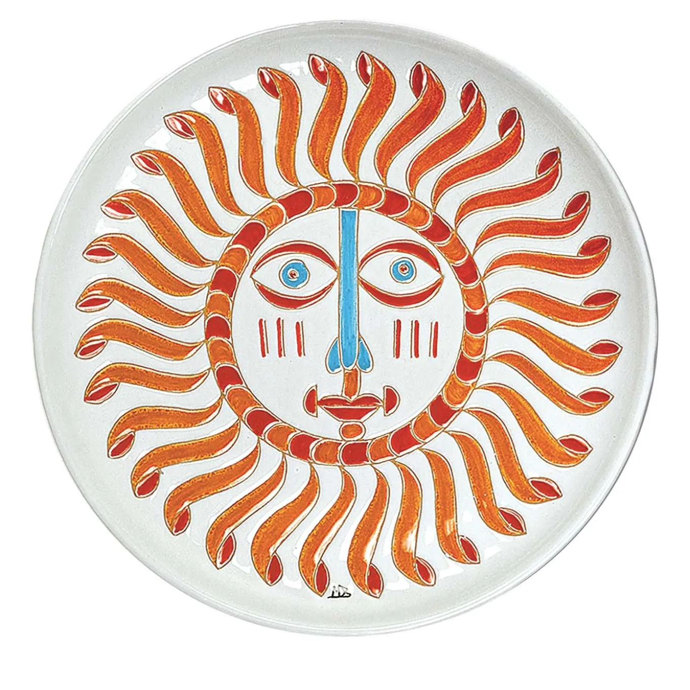This singular round tray combines the traditions and uniqueness of Sardinia. It glows with the warm colors of summer (“estate” in Italian) and is completely crafted by hand. A hand-applied decoration of a stylized sun adorns the center, obtained with the age-old “graffito” technique, with scratches applied on the terracotta along with vibrantly colored enamels.
