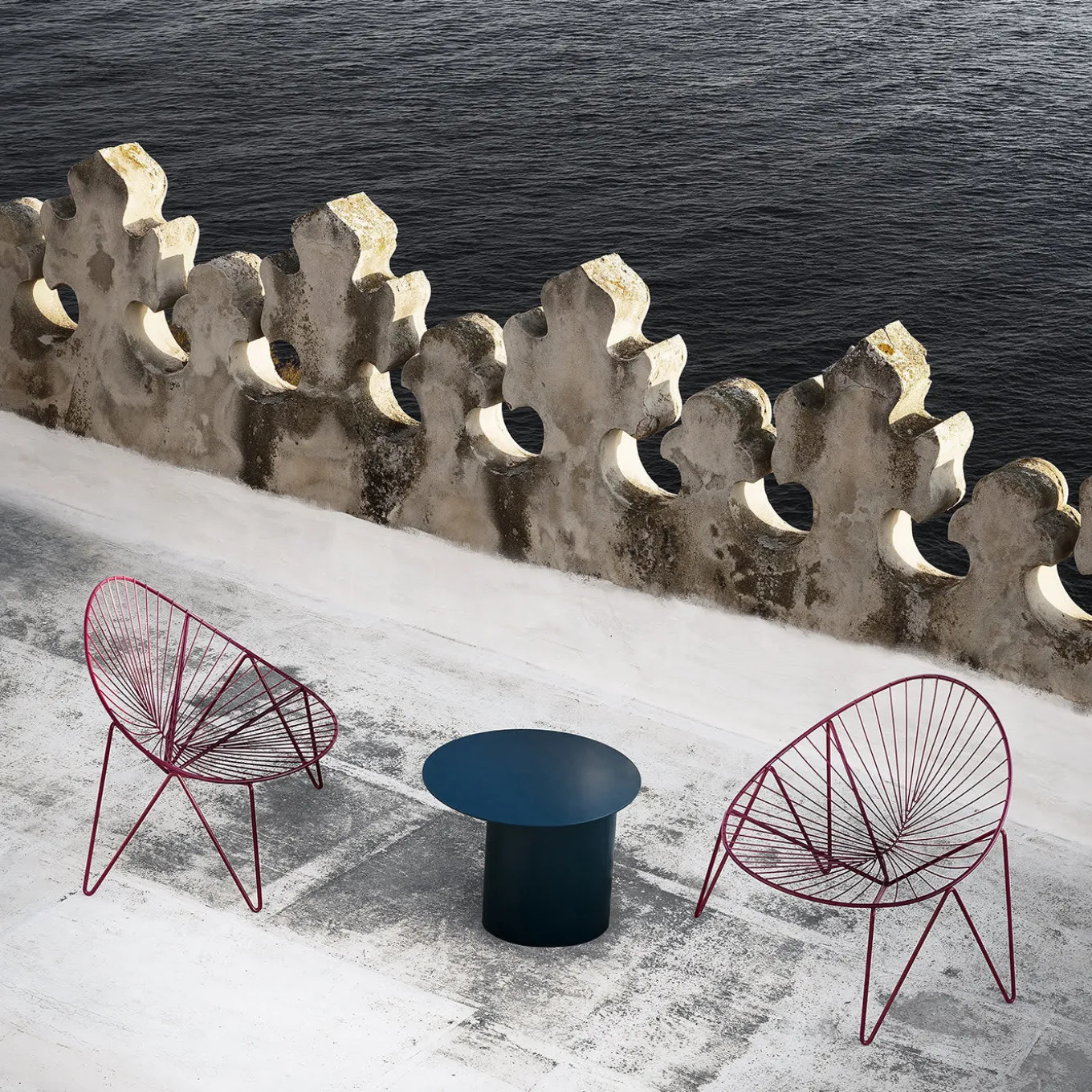 A testament to minimalist design, this table is both suitable for indoor and outdoor decors. A splendid combination of smooth textures and geometric shapes, this piece is composed of a cylindrical base made of bent steel and the round top also made of steel finished in stunning blue-green color. This piece is customizable in colors and can be requested with a height of 45.5 cm at additional cost. Please ask the Concierge for details.