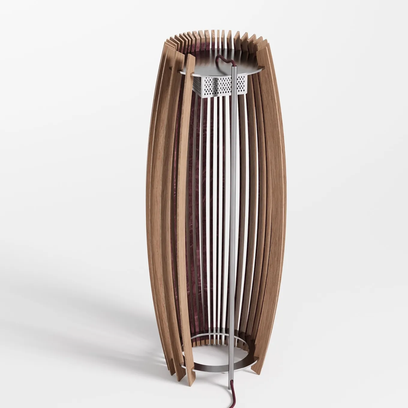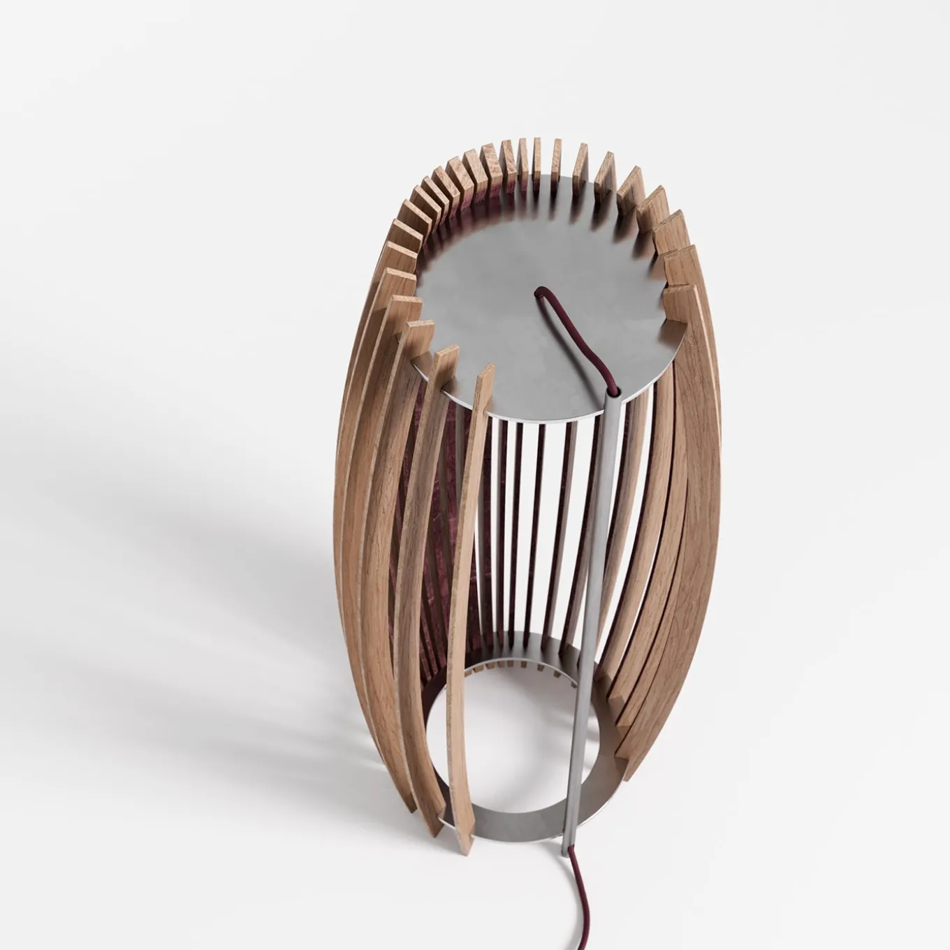 Ibla, when stainless steel structure supporting 25 parasymmetrical strips from the oak staves surprises even the most expert eye. The front part, more intimate, whose thinner and closer strips create a harmoniously varied play of light differs from the back area, whose strips are thicker and differently spaced one from the other to create a unique light play.