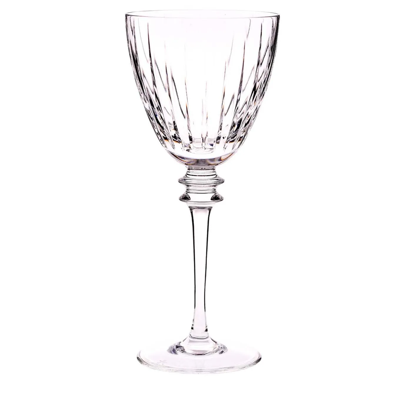 A refined addition to both classic or modern collections, this set of six wine glasses stands out for the quiet elegance of the lines enlivening the bowl’s aesthetic. Sinuous detailing accents the stem, easing the grip while enhancing the visual quality of the stem. The set will make for a spot-on pairing to its water stem glasses counterparts, for a glare that is sure to enrich any table setting.