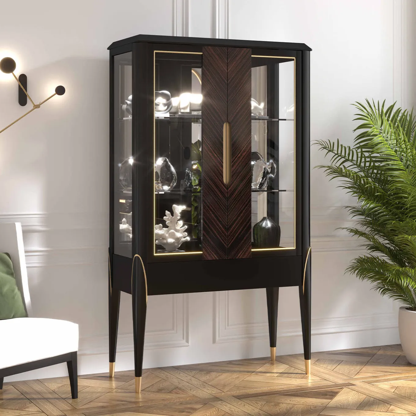 A timeless design of Deco inspiration, this bar cabinet will make for an exclusive addition to a modern style interior, imbuing it with exceptional refinement. It features a two-door glass vitrine, enriched with ebony-veneered wood, and a black-lacquered wooden structure with glass shelves. Enriched with gold leaf details and satin brass handles and inner led lights. Please consult the Concierge for further details.