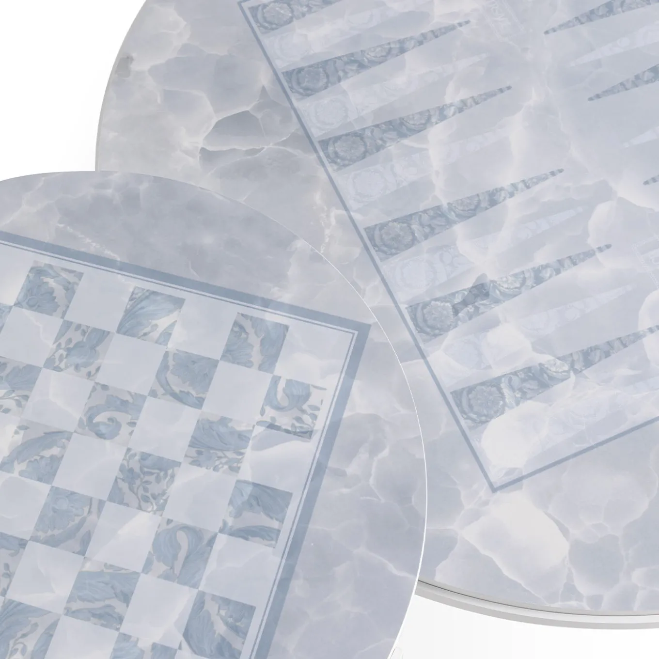 The Iconic round side table features a gres porcelain top with a distinctive chessboard pattern, supported by a white soft-touch painted steel frame. The structure highlights a 3D metal Medusa logo with coordinated finishing, blending minimalist design with luxury. Designed for outdoor use, it complements various settings while offering enduring style and comfort with its refined materials and elegant geometric motif. Limited Edition. Also available in a sleek black soft-touch finish and with a variety of top options. Contact the Concierge for further information.