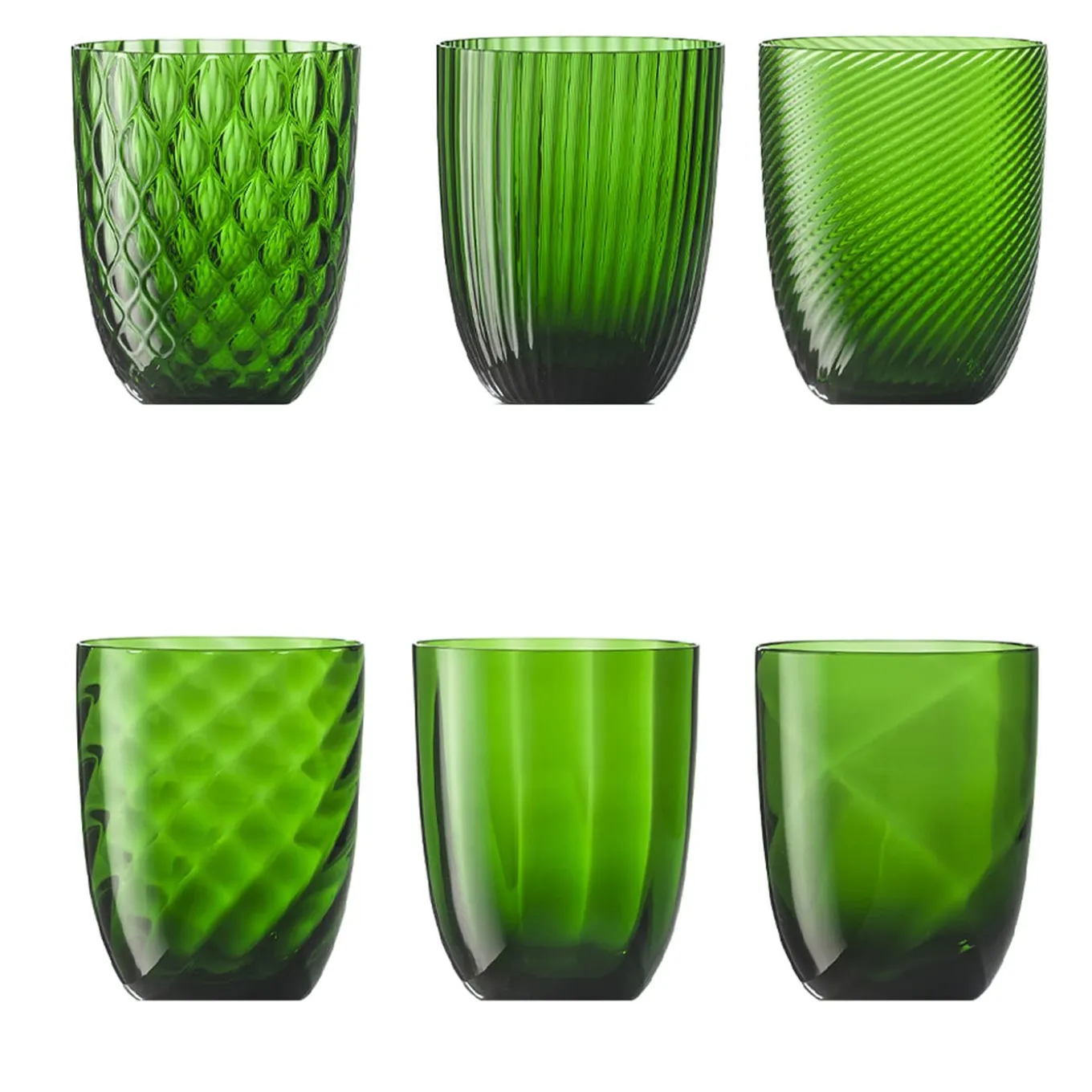 Sharing the same vivid pine-green tone, each of the six water glasses composing this Murano glass set flaunts a different elegant texture borrowed from century-old Muranese tradition, namely lente, ottico, ottico torsé, balloton, rigadin, and torsé. The masterful mouth-blowing and manual finishing steps imply the uniqueness of every piece. Multiple color options are available.