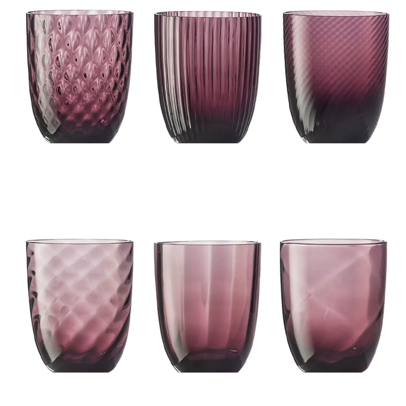 Simplicity meets dynamism in this exclusive set of six purple water glasses from the Idra Collection. The textures they boast are obtained by minutely following traditional Muranese techniques – namely lente, ottico, ottico torsé, balloton, rigadin, and torsé – for a dive into classic revealing its contemporary flair with the minimalist shape and naturally shaded coloring.
