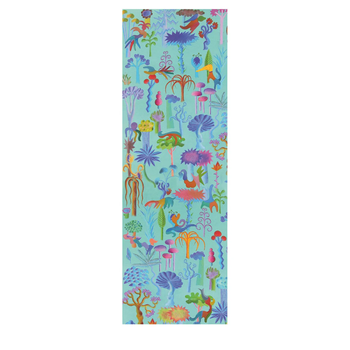 This stunning tapestry depicts a dreamy garden dotted with fantastic trees and animals. A bright turquoise backdrop allows the pattern to further stand out with its assorted vivid tones and minute details capable of opening a window onto fairytale imagery. The piece will be ideally fitted to ceilings, more functional to let its light filtering quality emerge.