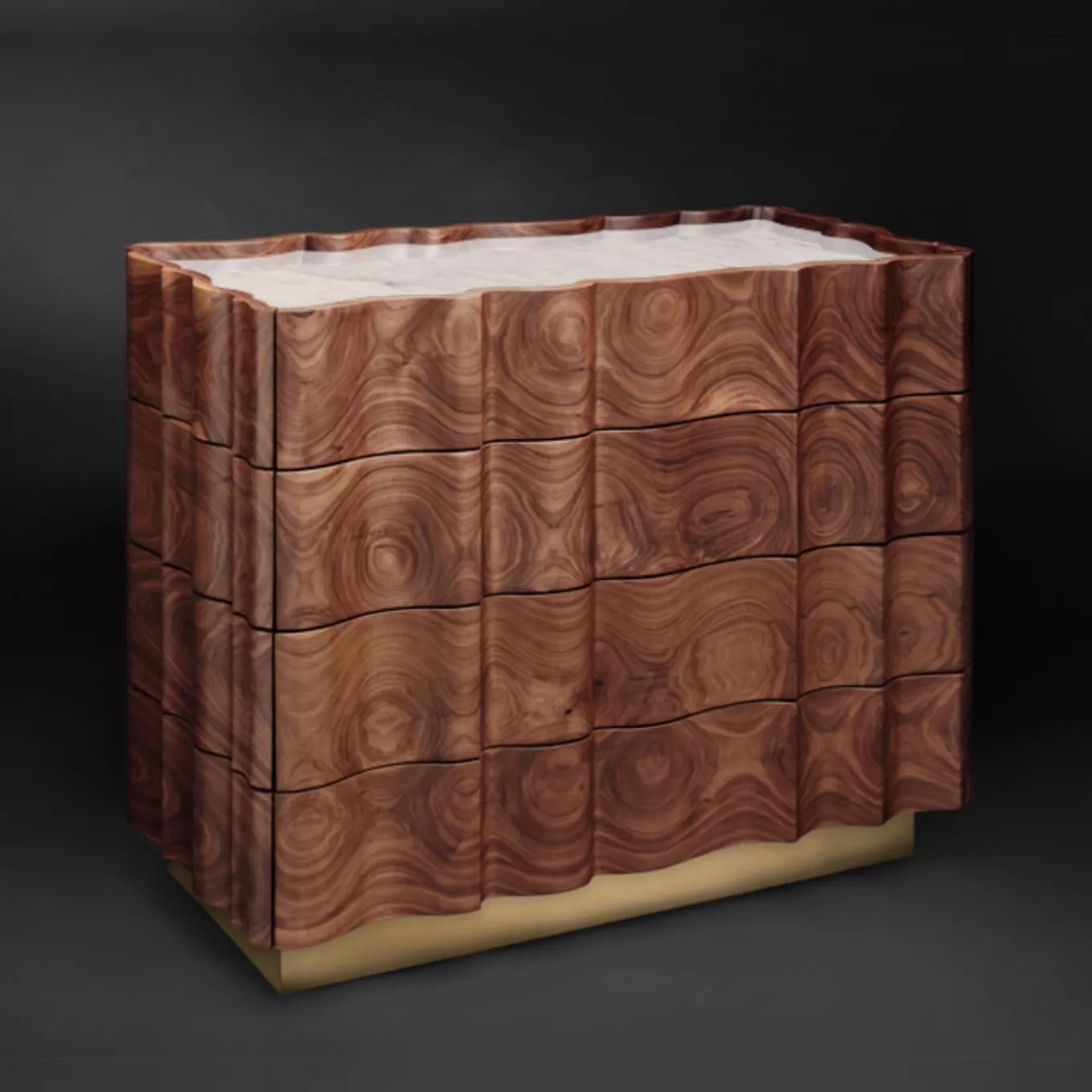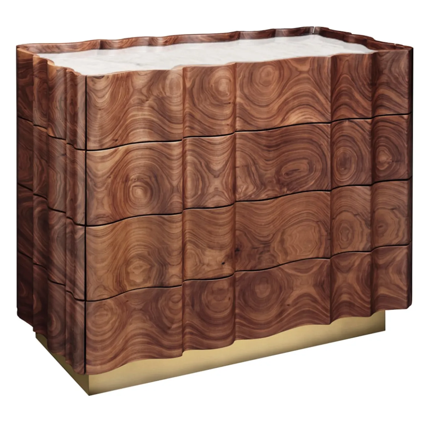 Il Pezzo 2 Dresser has a classic, sinuous shape. The top is a beautiful slab of white Carrara marble, the base is made of brass, while the walnut, made from a single piece, shows its magnificent grain.In each piece a small brass cylinder carrying a personalized number attests to its uniqueness and authenticity.This piece can be custom made to desired size and finish.
