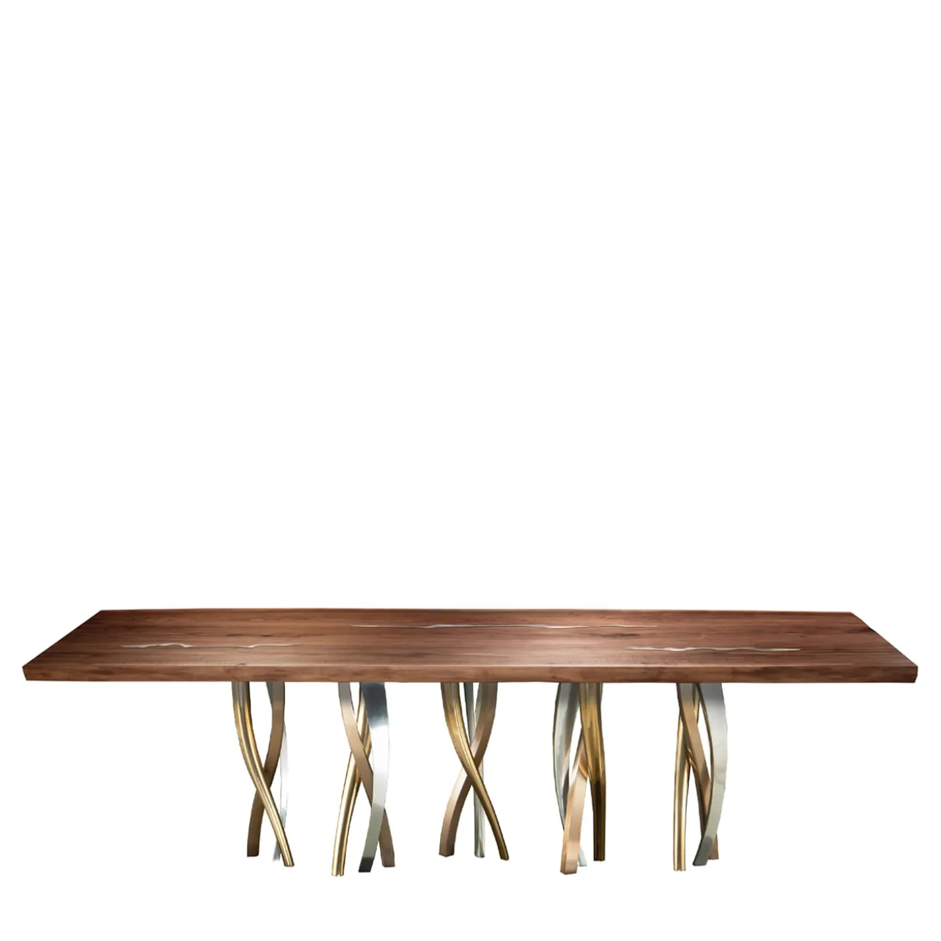Bundles of intricately intertwining and twisted metal legs in contrasting finishes of bronze, champagne, and nickel unmistakably state Il Pezzo 8 Table’s sculptural impact. Undergoing an organic silica-based treatment to be water-resistant, a majestic walnut top seals the design with timeless charm. Each piece includes a brass cylinder with a serial number, the so-called “missing piece” the brand is named after.