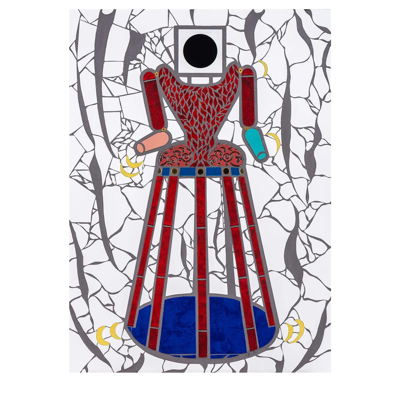 An android robot version of the Virgin Mary is the eccentric, provocative subject of this singular mosaic, the central element of a triptych inspired by the “A Boccaperta” tale Carmelo Bene wrote about San Giuseppe from Cupertino. Turned inserts enrich the triumphing assembly of ceramic tiles and plaster that outline the vaguely anthropomorphic figure. An authenticity certificate is included with purchase.