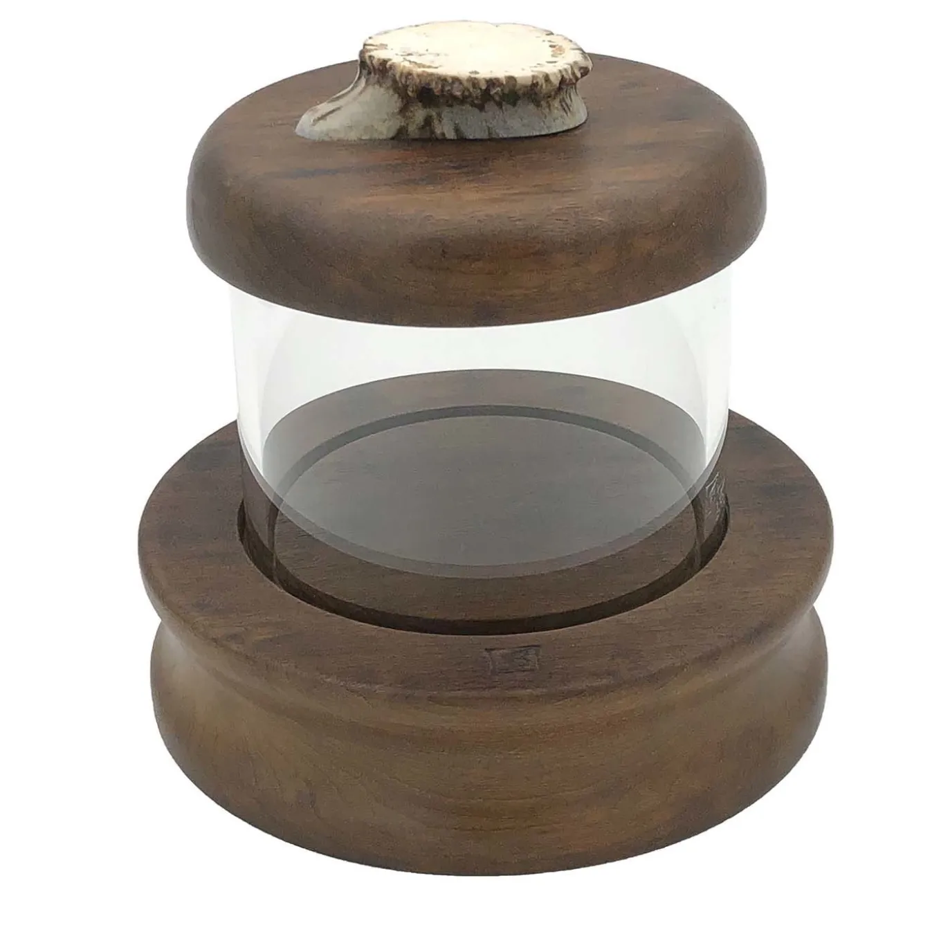 Simply elegant and functional, this truffle holder makes the perfect gift for those who can appreciate unique objects and unparalleled craftsmanship. Designed to keep the truffle fresh and at the right moisture level, this piece is handmade of smooth imbuia (Brazilian walnut) wood with a sturdy round base where the borosilicate glass container rests. The lid, also of imbuia wood, is enriched with a finial of genuine antler horn showcasing its unique, natural color.