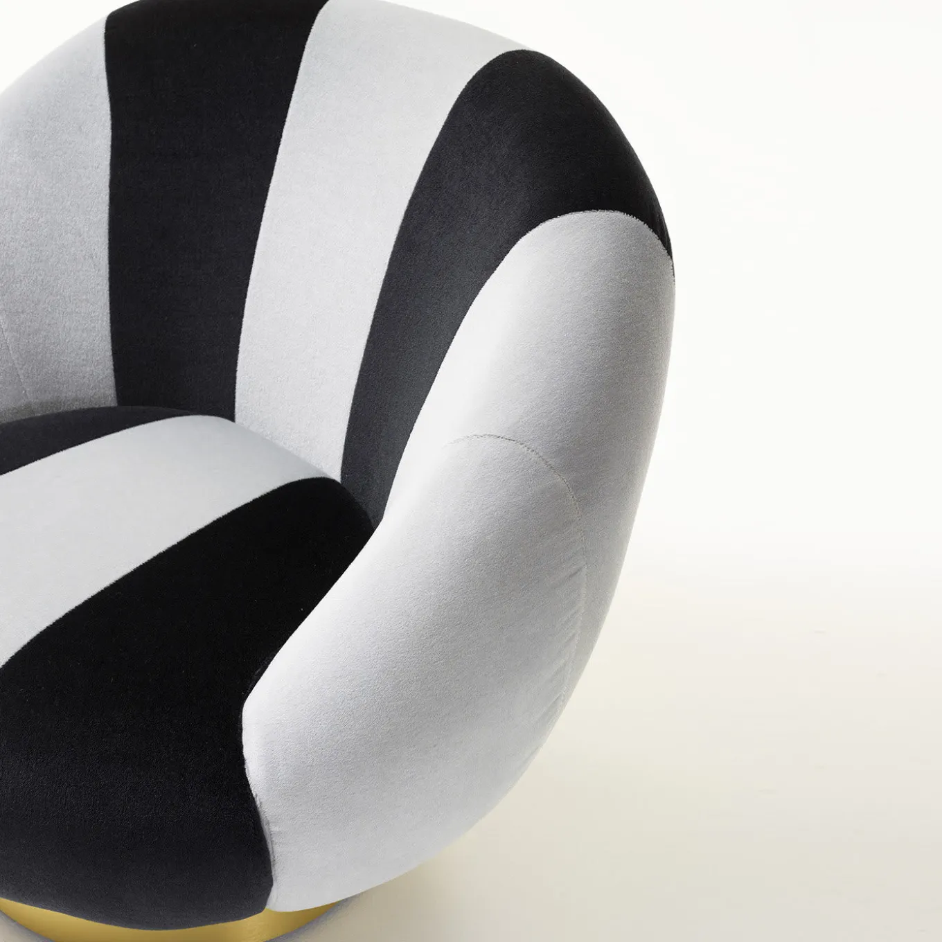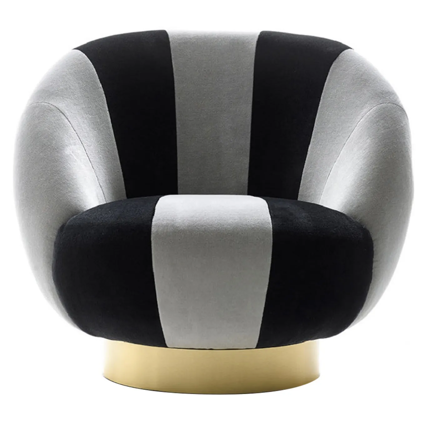 This elegant black and grey swivel armchair, designed by Studio 63 for Marioni, features a metal structure and is available in different fabric or leather upholstery.