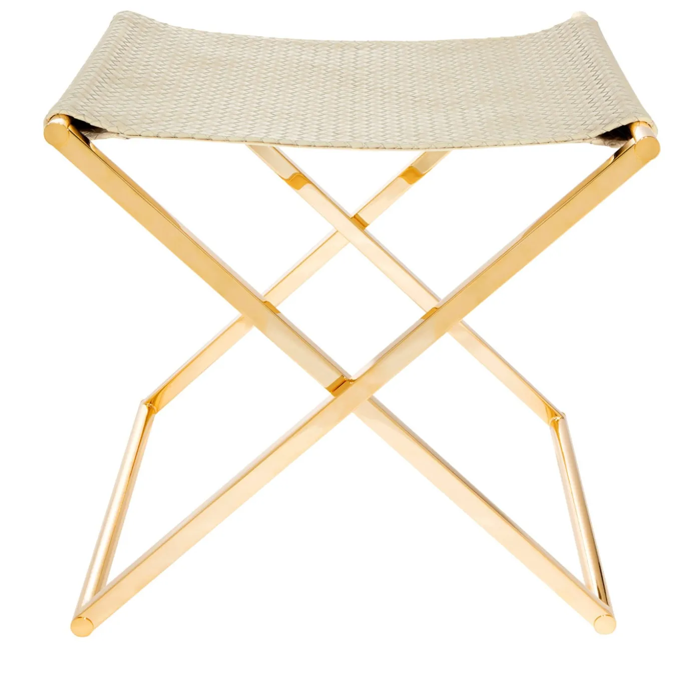 Folding stool/luggage rack with handwoven leather seat, and chrome or gold metal legs.
