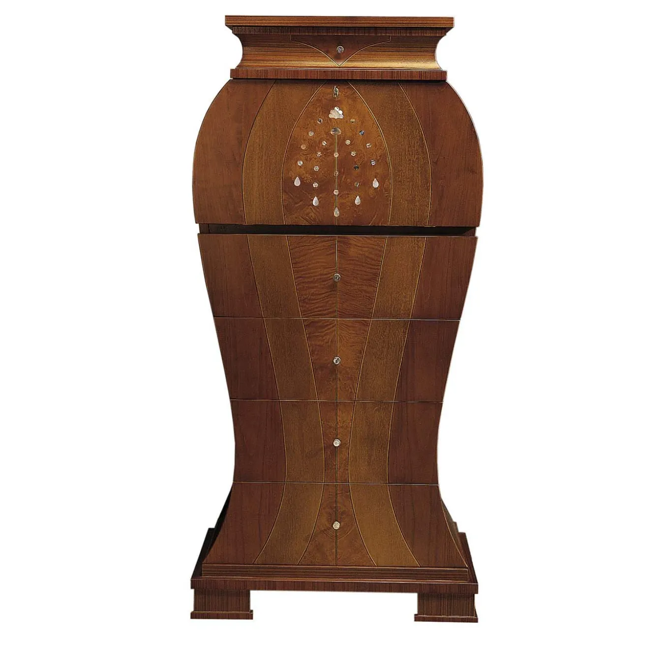 Classic and sophisticated, this chest of drawers will be an eye-catching addition to a bedroom or study, where it will not only store everyday necessities, but imbue a room with elegance and timeless allure. Rich in precious details, this piece boasts exquisite craftsmanship in both its sinuous and elongated silhouette and in the cascade of inlay work that incorporates real mother-of-pearls. The solid wood structure alternates bands of cherry, zebrawood and briar root. The handles of the variously sized drawers are also in mother-of-pearl.