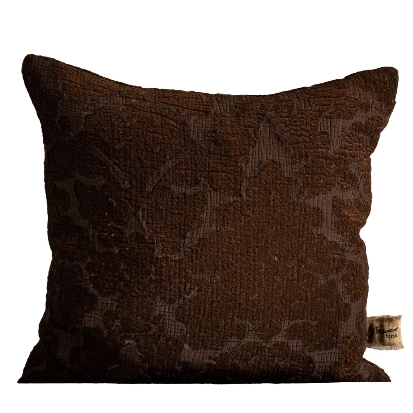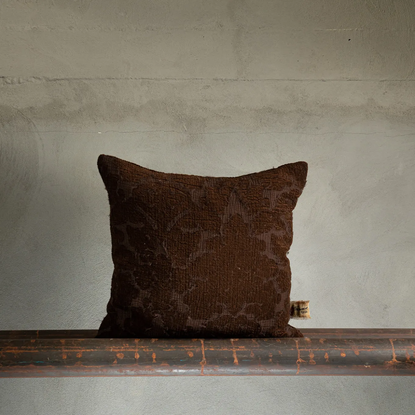 An ideal addition to earth-toned decors with its rich shade of dark brown, this square cushion is at once bold and romantic. The cover’s jacquard silk weft flaunts a delicate floral design, lending the cushion an intriguing look and feel that unmistakably states its artisan quality.