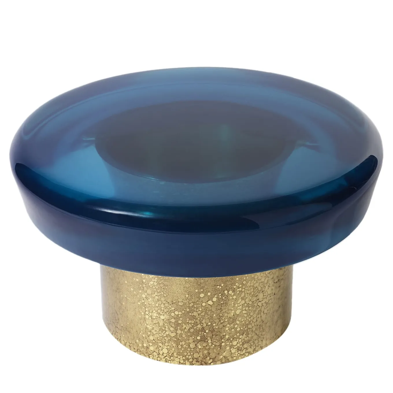 Jade coffee table features ethereal transparency and a reflective surface that plays naturally with light. The brightly colored tabletop rests on a cylindrical brass base, whose distinctive veining is achieved through a skillful etching treatment. The juxtaposition of the ever-unique shades — meticulously blended in our atelier — and the golden accents makes it a precious piece. All of the epoxy resin tops belonging to this series are designed to be interchangeable. Available in different colors.