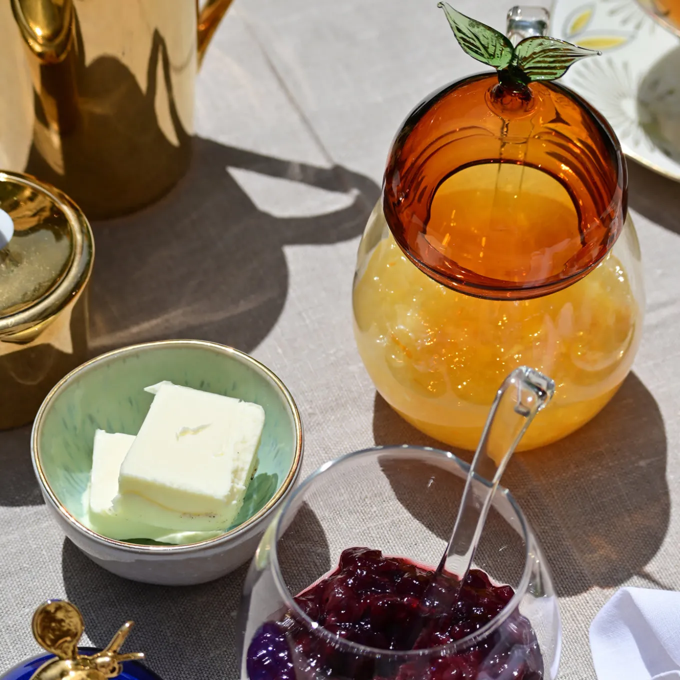 Serve breakfast in style with this stunning, sophisticated container for jam, confiture or preserves. Its transparent glass bowl is topped by a transparent, orange glass lid with a green leaf detail. A matching, clear glass spoon adds an extra touch of elegance and style. The result is a delicate, romantic item with a hint of nostalgia. Handcrafted in Venice.