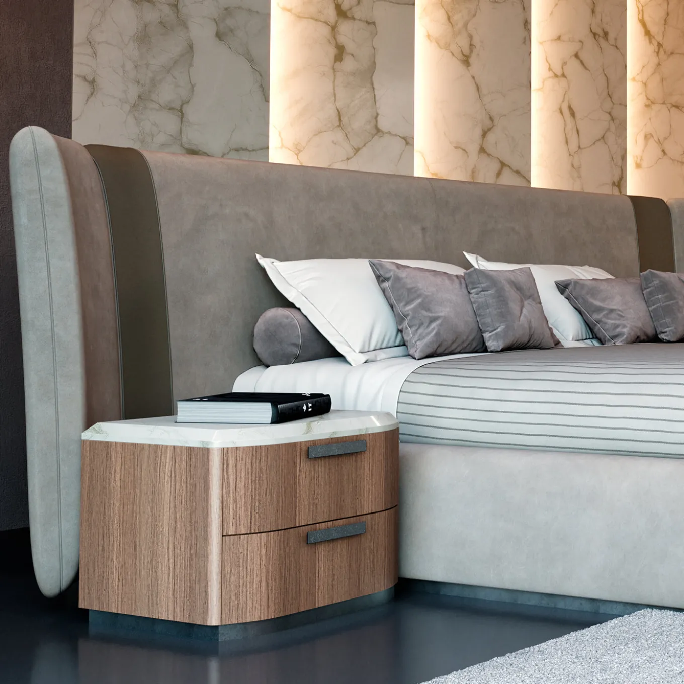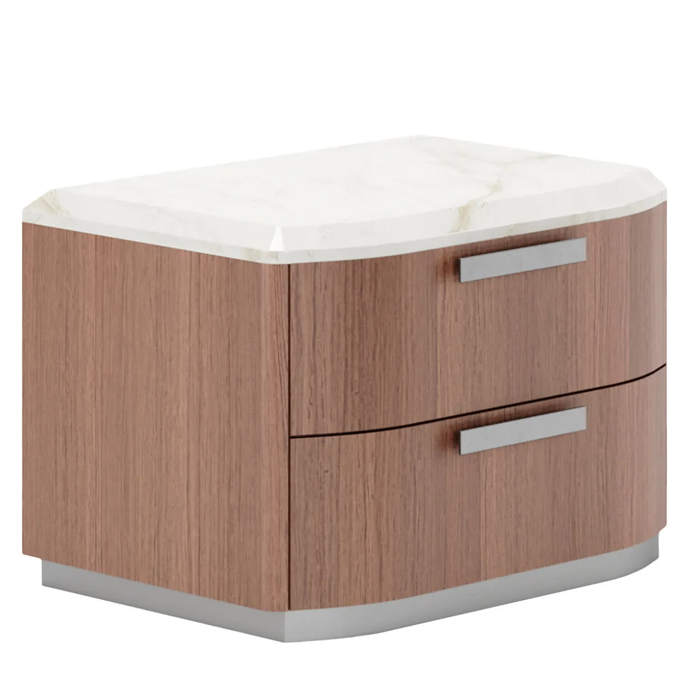 A piece capable of infusing modern bedrooms with a clever mix of opulence and freshness, this nightstand boasts a dynamic geometric cut softened by the presence of its walnut veneer’s natural grain and beveled marble top’s traceries. The two practical drawers are equipped with streamlined handles, which are made of titanium-finished metal and match the plinth base.