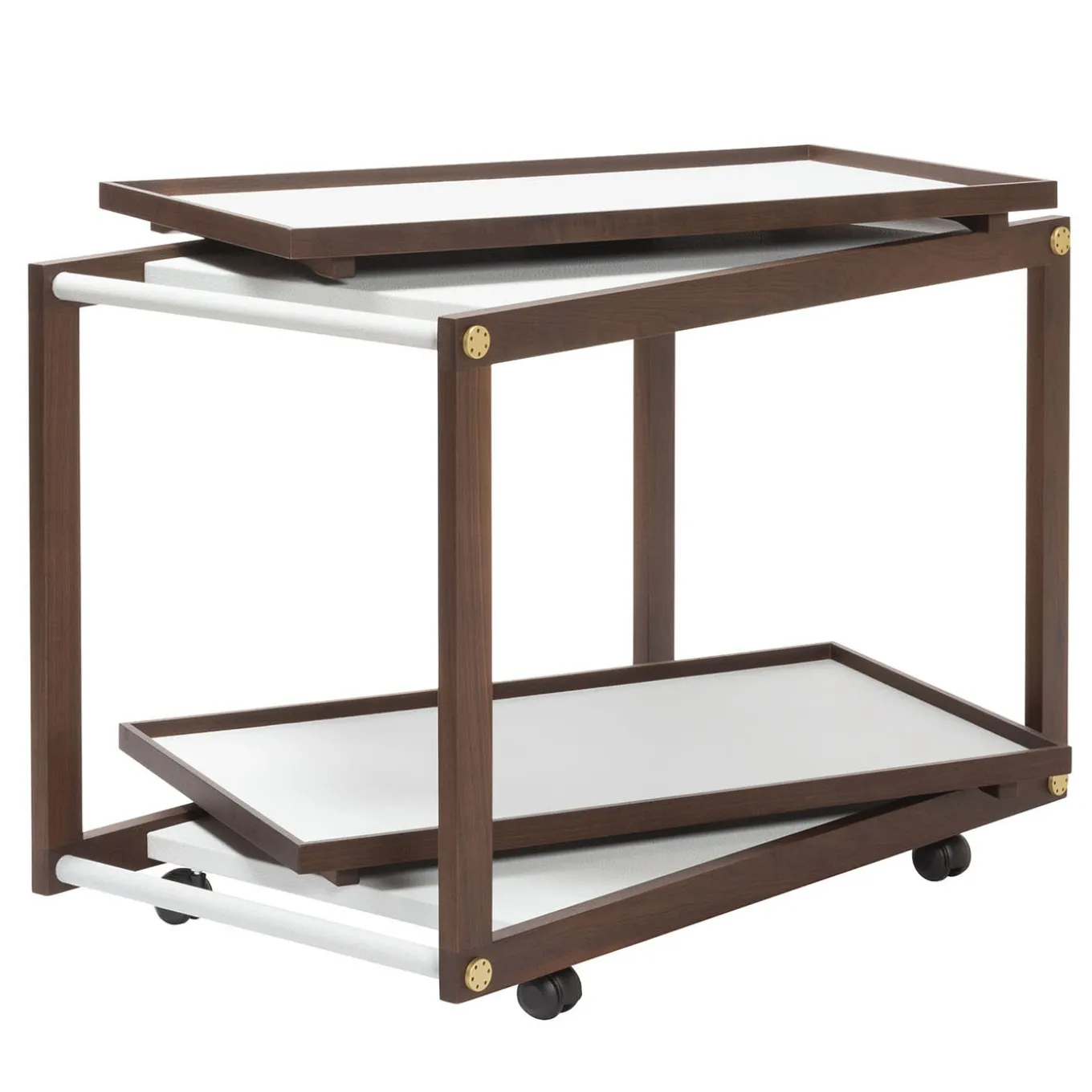 Wood structure is available in different finishes featuring fine leather and metal inserts. Provided with two removable trays and omnidirectional wheels. Different walnut wood and metal finishes are available upon request.