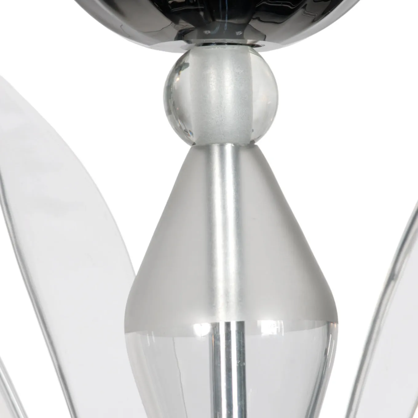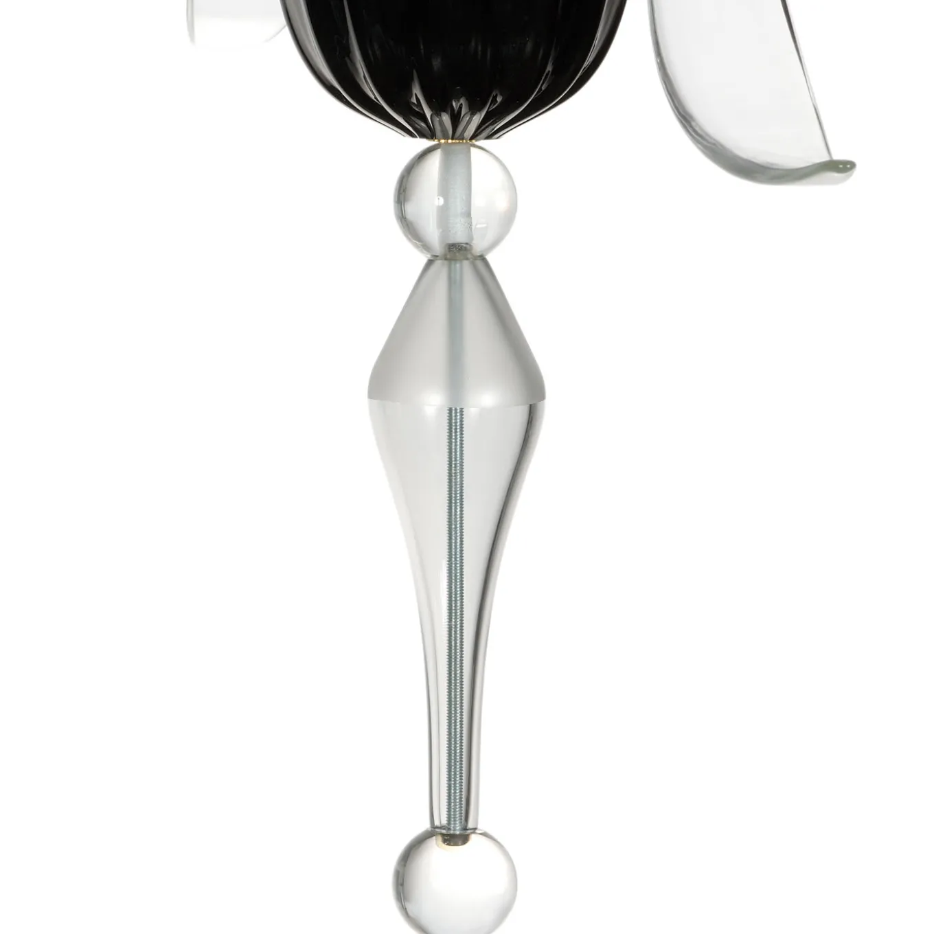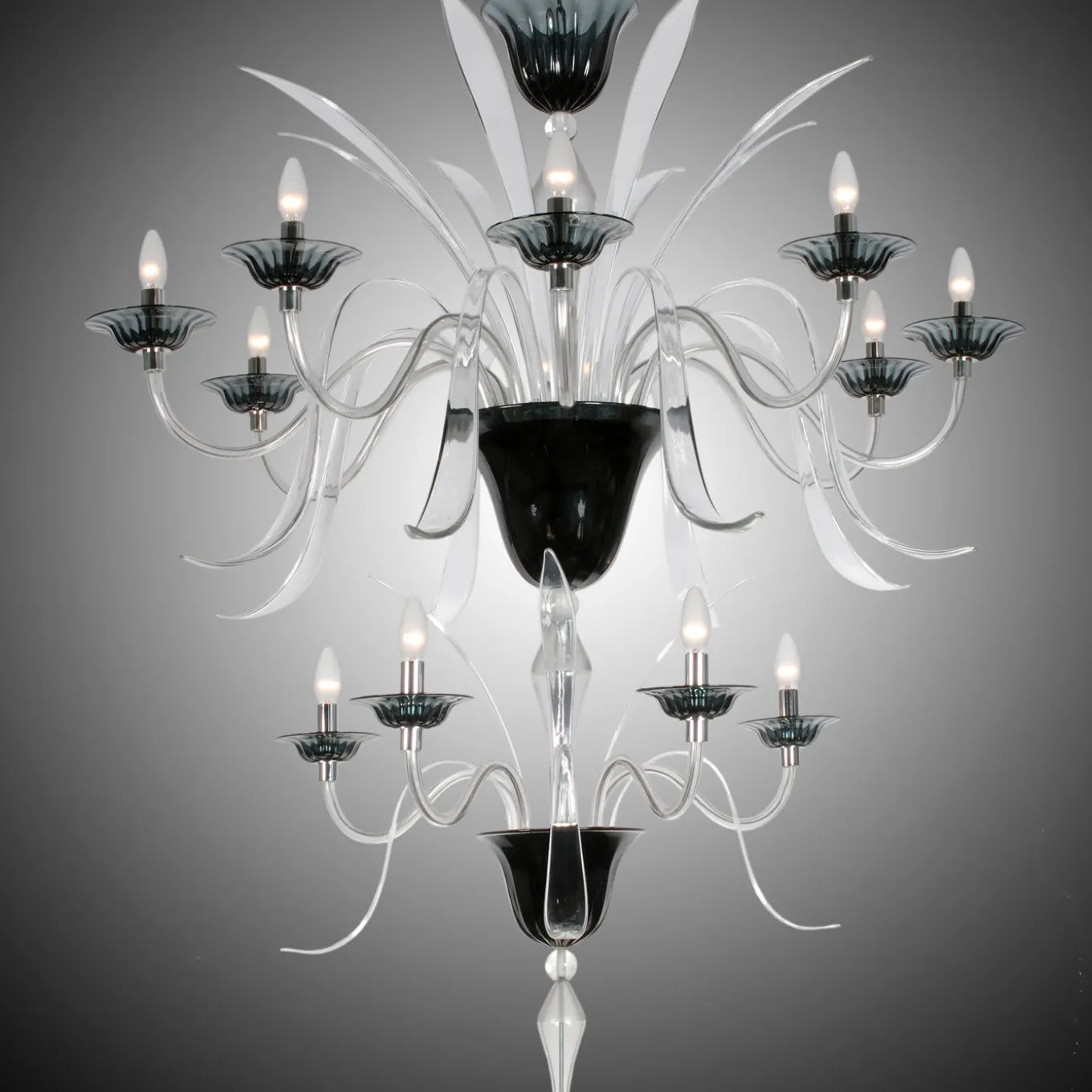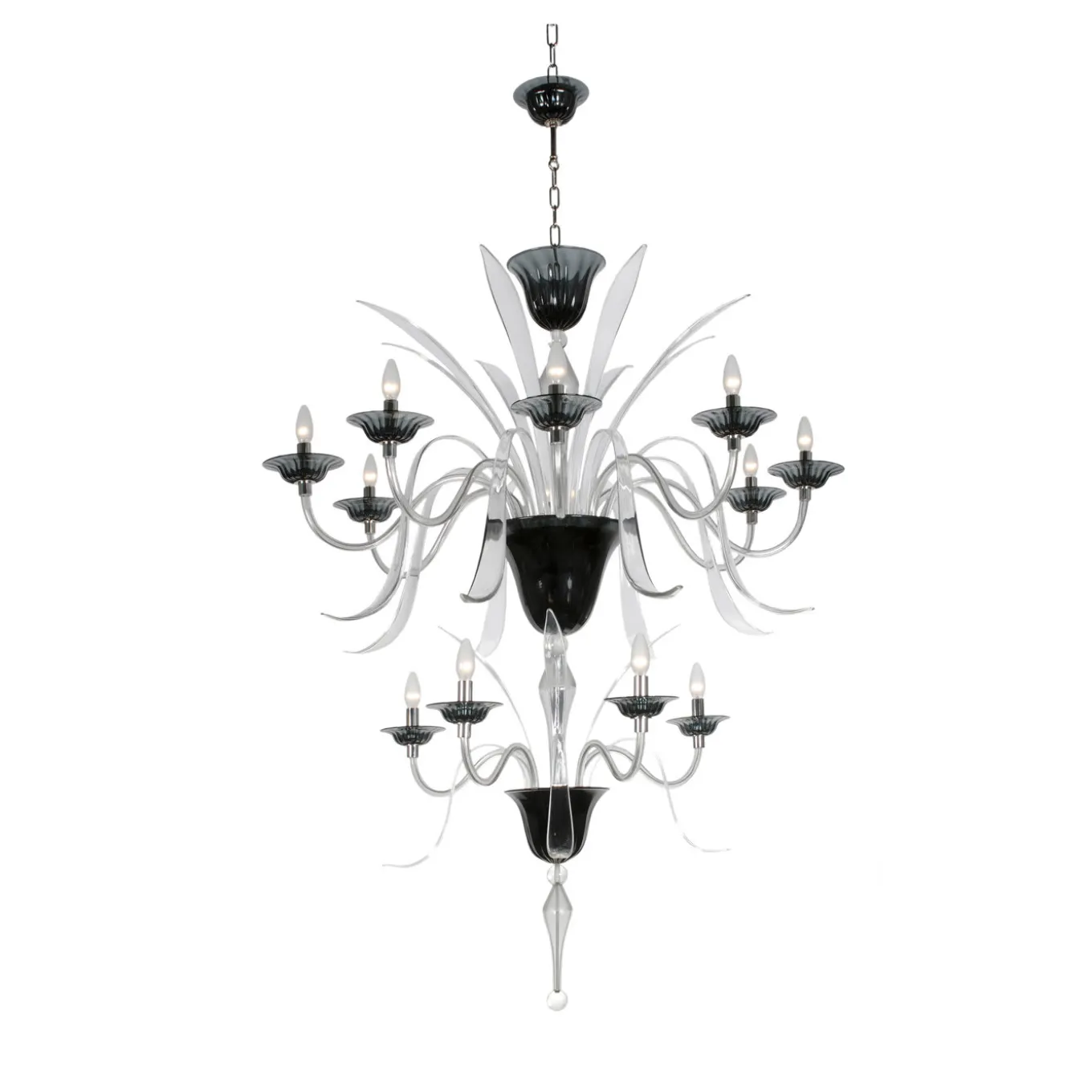 This elegant chandelier in mouth-blown Murano glass features two tiers for a total of twelve lights. Each tier is supported by a black glass upside-down cone, while the finely executed arms are in clear glass. Each of the lights is resting on a fine black glass support. The striking contrast between the black and clear glass details gives this piece a contemporary flair and a majestic effect.