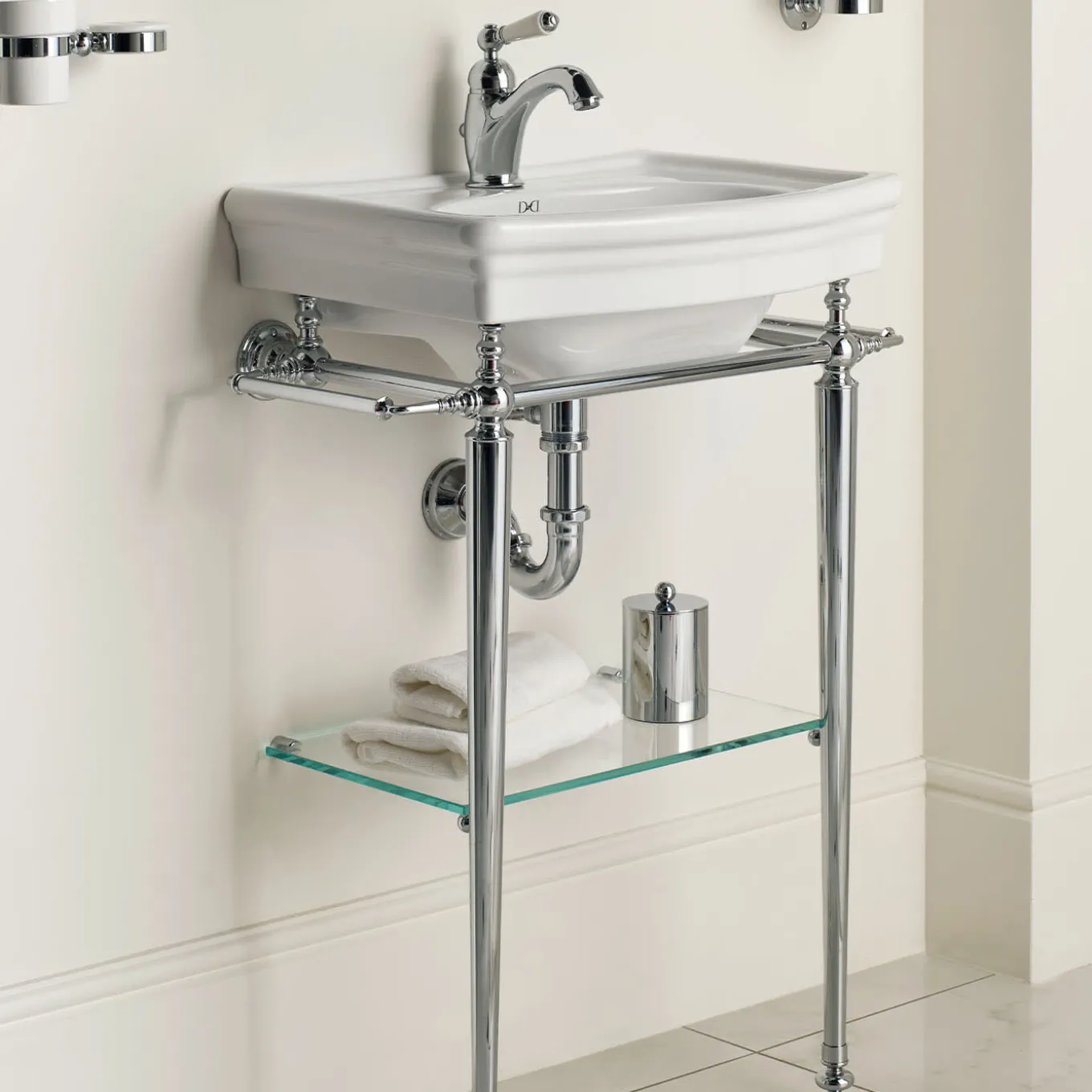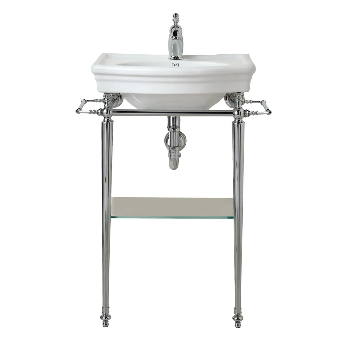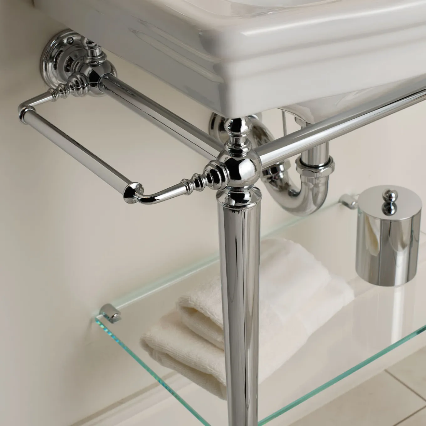 Inspired by the iconic 40 cm deep Etoile console, Jolie is the perfect solution for bringing the sophisticated design, quality materials, and meticulous craftsmanship traditionally reserved for master bathrooms to the smaller spaces of contemporary living. The brass structure in chrome finish, incorporates two side towel rails, a glass shelf and supports a ceramic washbasin with classic lines. The faucet is not included.